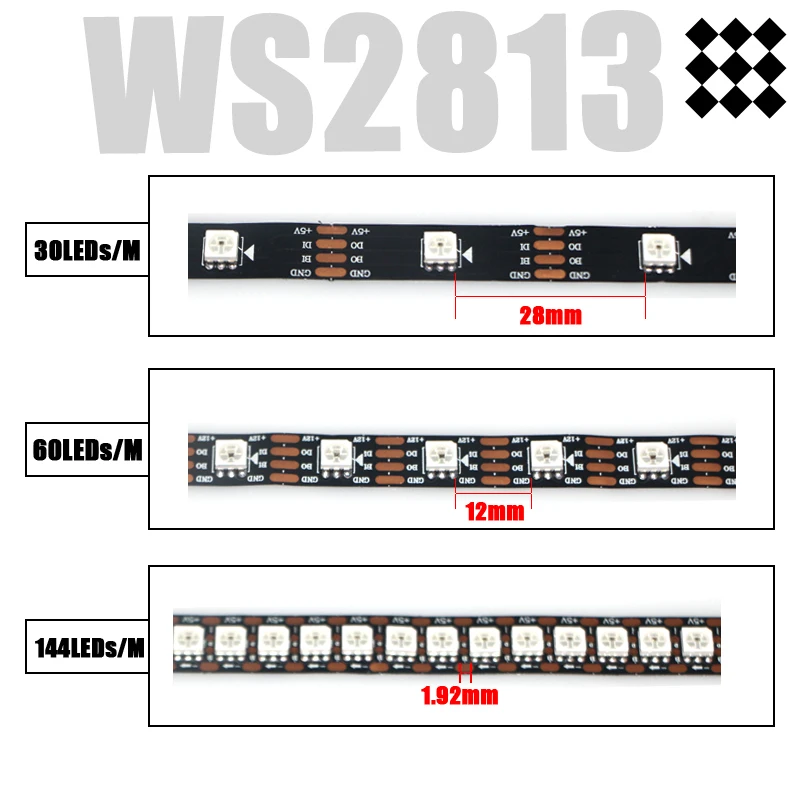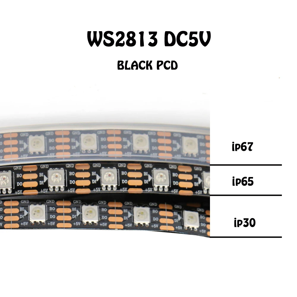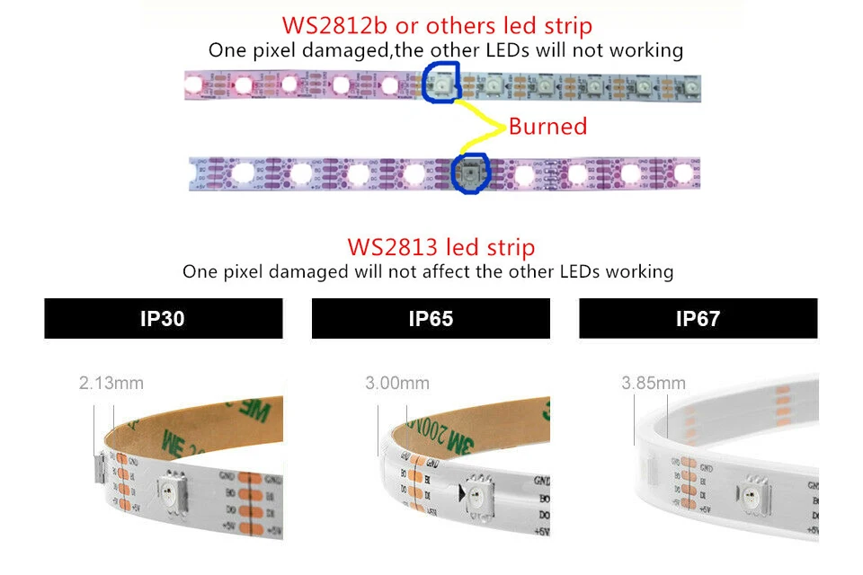 Ws2812b: повреждение одного пикселя повлияет на работу других светодиодовWs2813: один пиксель поврежден не повлияет на работу других светодиодов(1) IP30 --- не водонепроницаемый, для использования в помещении(2) IP65 --- силиконовое покрытие, легко режется, наружное использование(3) IP67 --- силиконовая трубка, должна быть восстановлена после резки, уличное использованиеЦена только Светодиодная лента, не включает блок питания или светодиодный контроллер!