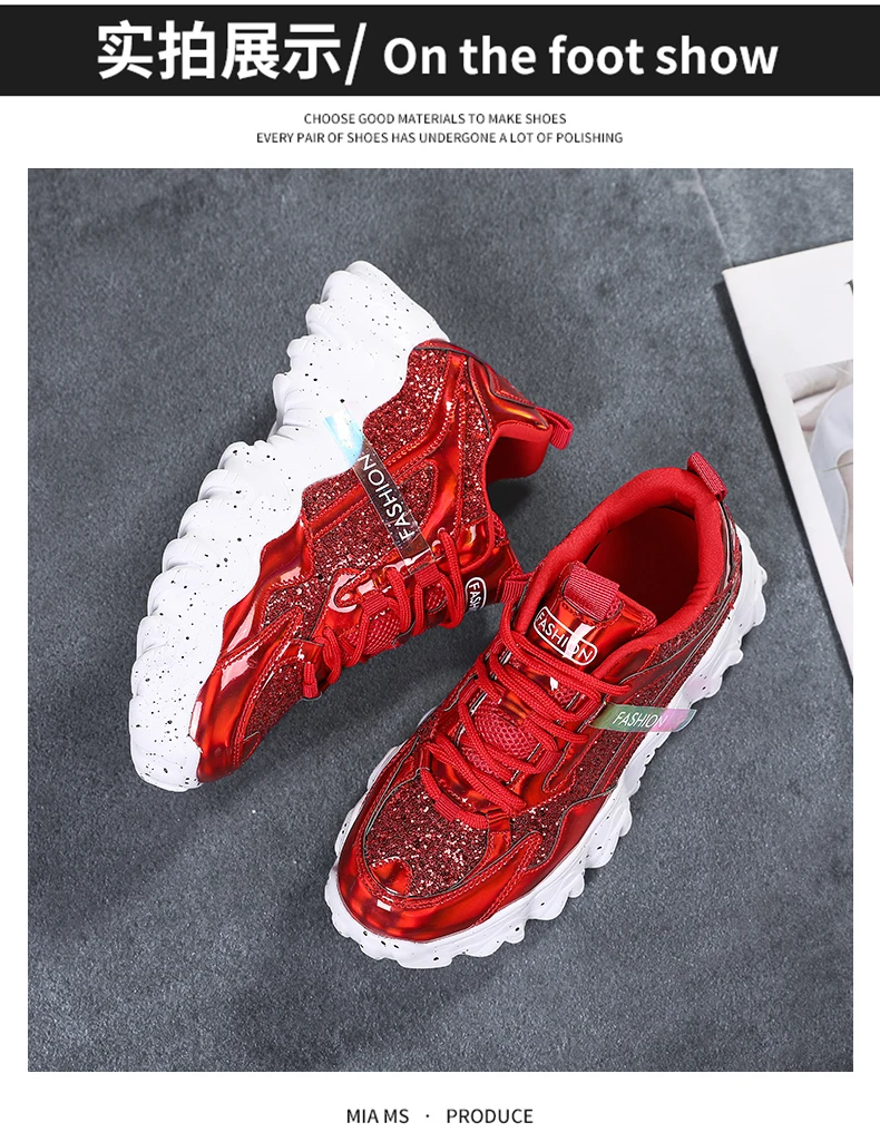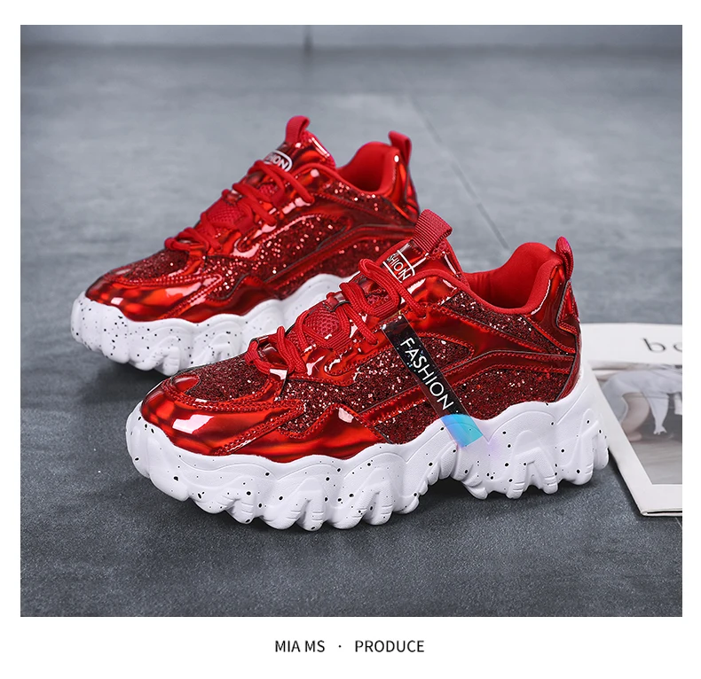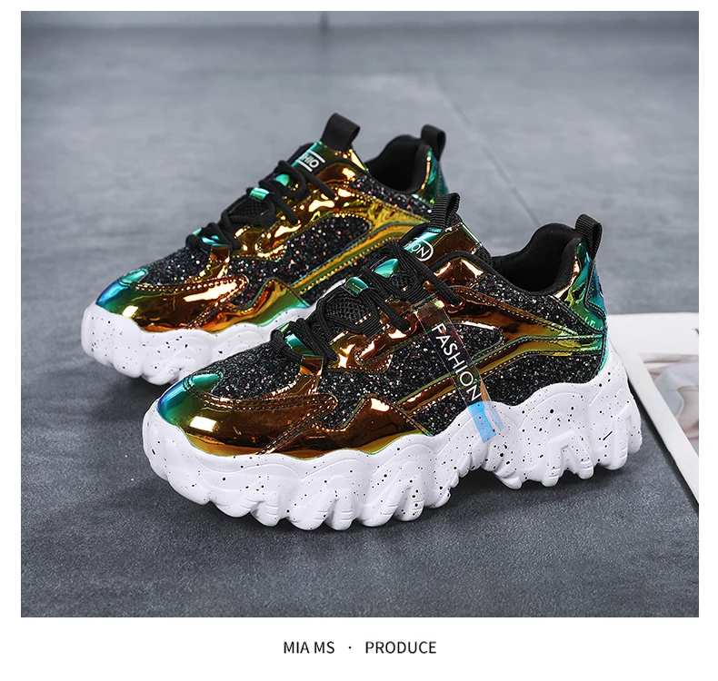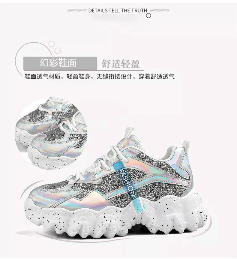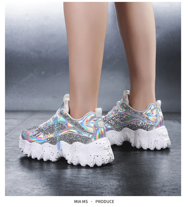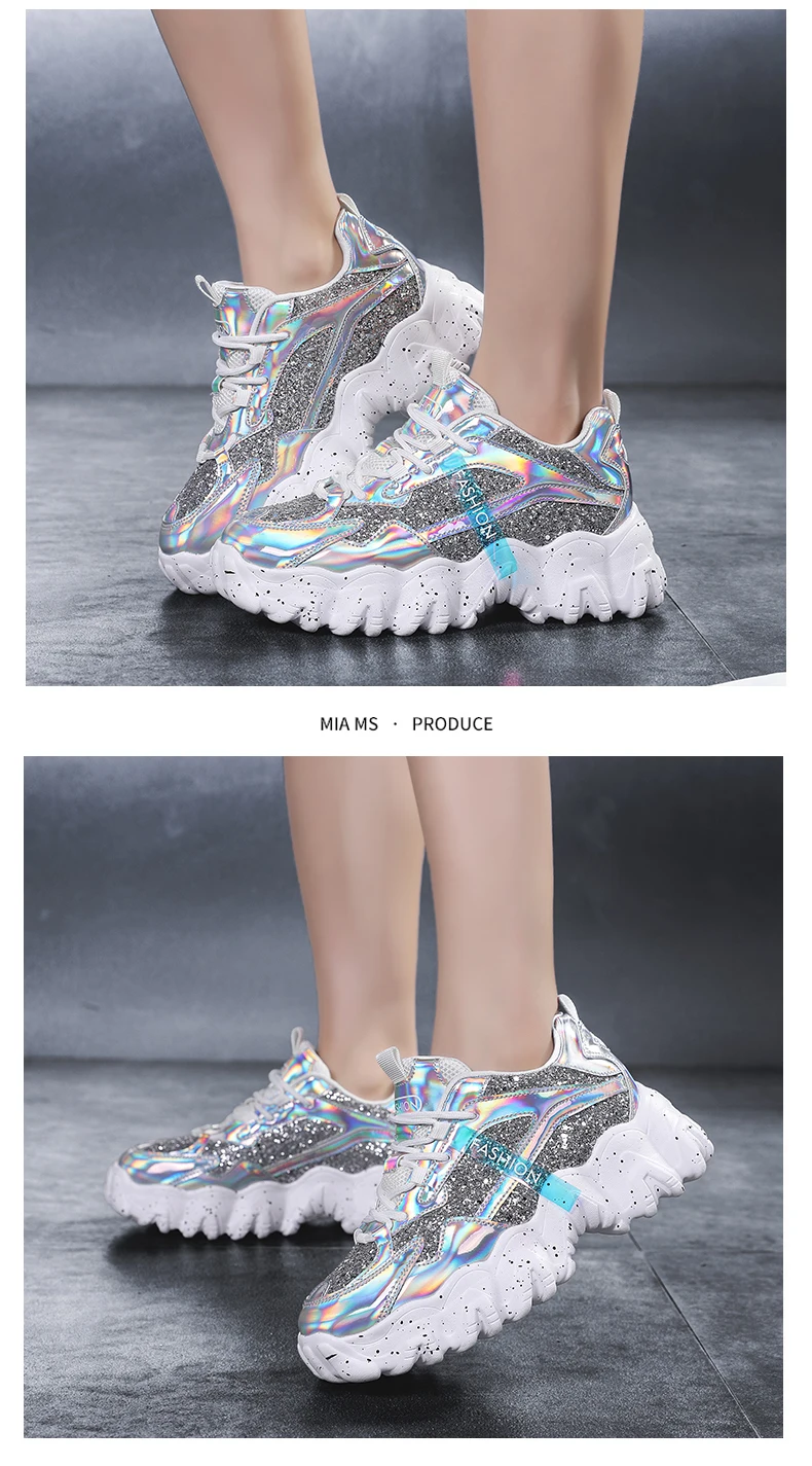 Кроссовки женские блестящие, повседневная обувь на плоской платформе, массивные, модные