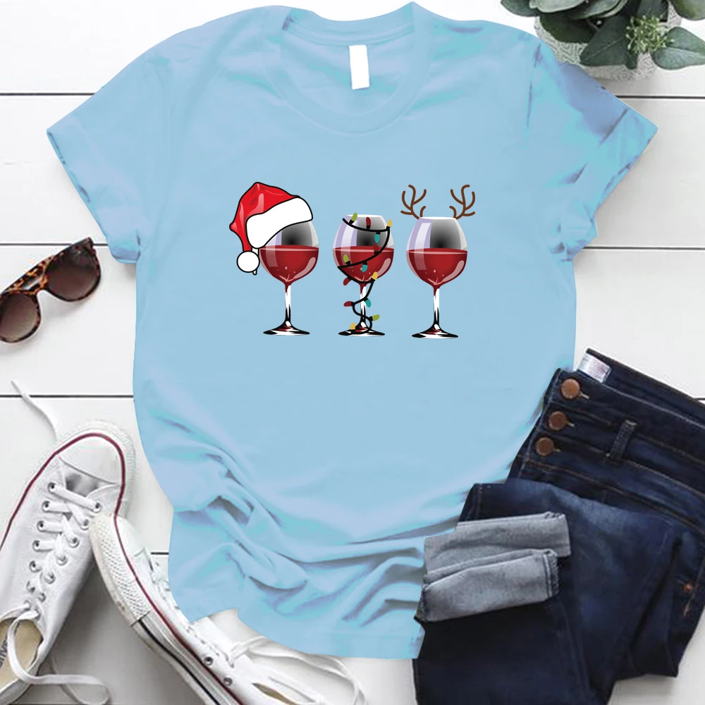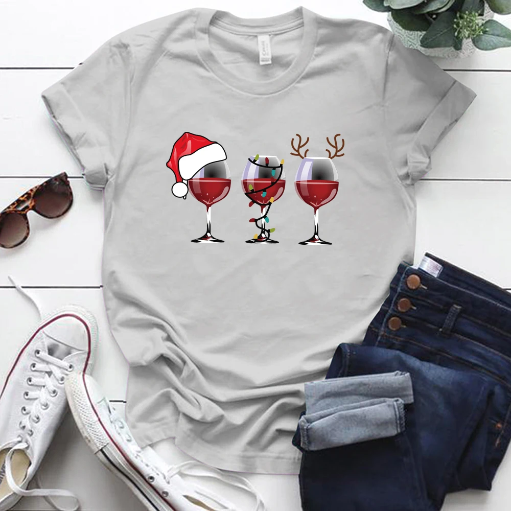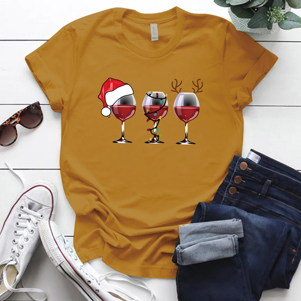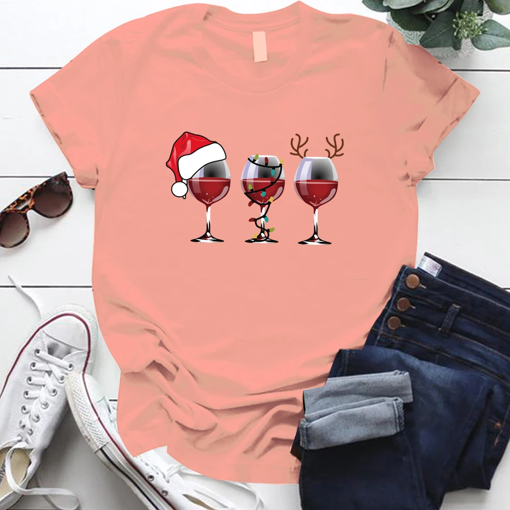 Рождественская футболка, забавная Рождественский бокал для вина, свободная футболка с принтом Санта-Клауса, праздничная футболка с коротким рукавом, S-5xl, женские футболки, топы