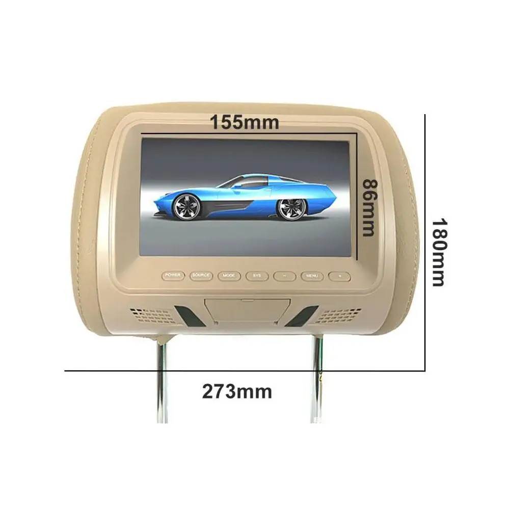 Особенности:7 дюймов (16:9) подголовник автомобиля ЖК-дисплей монитор (800*480 * RGB).2 видео входа, 2 аудио входа являются дополнительными.Функция USB/SD/TV (опционально).Обратное изображение: вверх/вниз/влево/вправо.Два видео входа, можно подключить к навигационной DVD.Расстояние между двумя полюсами регулируется 13-18 см, подходит для установки всех моделей.Соотношение функций переворачивания экрана: 16:9/4:3 легко переключаться.Беспроводной пульт дистанционного управления.Доступны многофункциональное языковое меню, китайский, английский, французский, немецкий, японский и другие языки.Когда Видеосигнал исчезает, синий экран автоматически отображается.Спецификация:Цвет: бежевый, серый, черныйМатериал: АБС + кожаРазрешение: 800*480 или 1024*600Потребляемая мощность: DC12V/7 ВтСистема: PAL/NTSC автоматическое преобразованиеРабочая температура: + 5 ℃ ~ + 40 ℃Температура хранения: -20 ℃ ~ + 60 ℃Размер подголовника: около 273*180*124 мм/10,75*7,09 * 4.88in (размер экрана 7 дюймов)Сталь колонка: регулируемое расстояние 110-190 мм; Диаметр колонны: около 10-12 мм/0,39-0.47inКомплектация: подголовник (1 шт.) + дистанционный пульт (без батареи) + стальная труба (2 шт.) + пластиковый адаптер + Руководство пользователя + USB кабель (1,6 м)Упаковка: коробкиВес брутто: около 1200 гУпаковочный лист:1 x Автомобильный подголовник1 x пульт дистанционного управления (без аккумулятора)2 х стальные трубы1 х пластиковый адаптер1 x Руководство пользователя