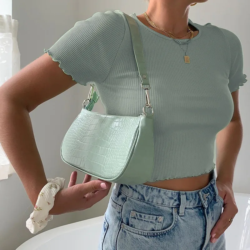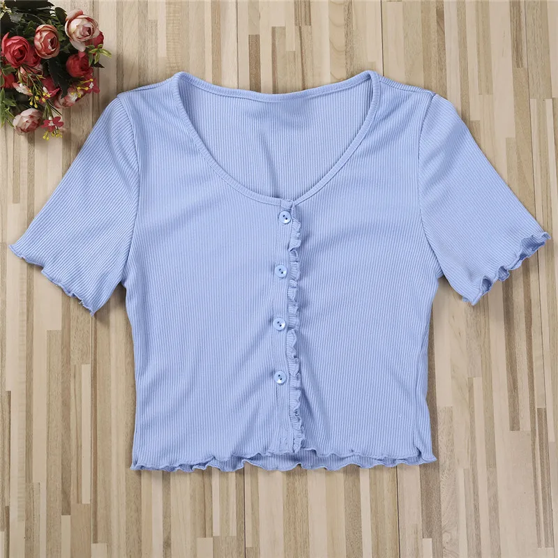 Футболка в рубчик с коротким рукавом, женские короткий топ с рюшами, сексуальные короткие топы, однотонная, на пуговицах, модные трикотажные топы в стиле Харадзюку