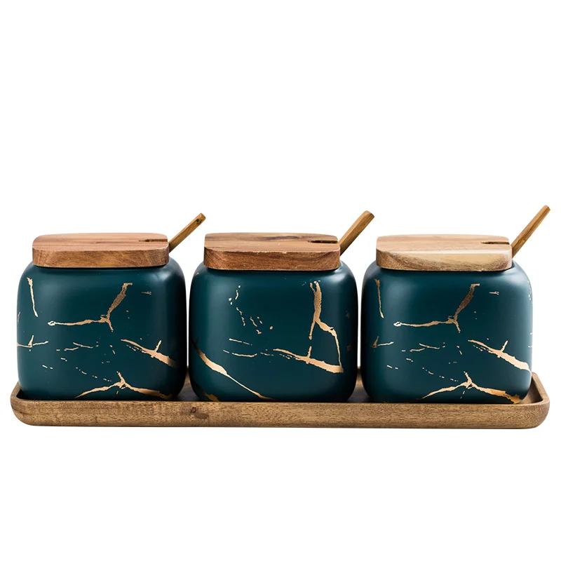 Набор керамических емкостей для приправ с мраморным узором, деревянная крышка, емкость для хранения сахарной соли, солонка, емкость для специй, кухонные аксессуары