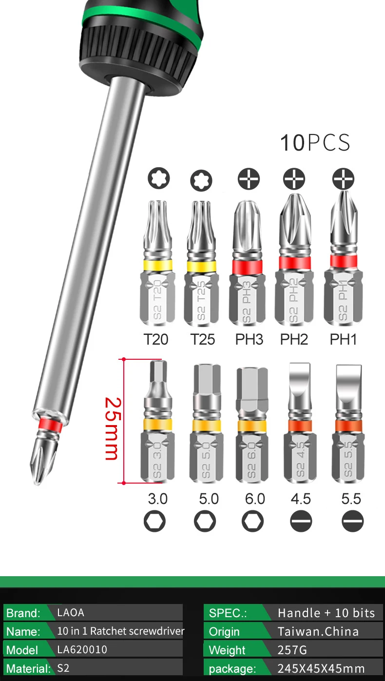 Набор отверток с храповым механизмом LAOA, 10 в 1, с 10 битами S2, ...