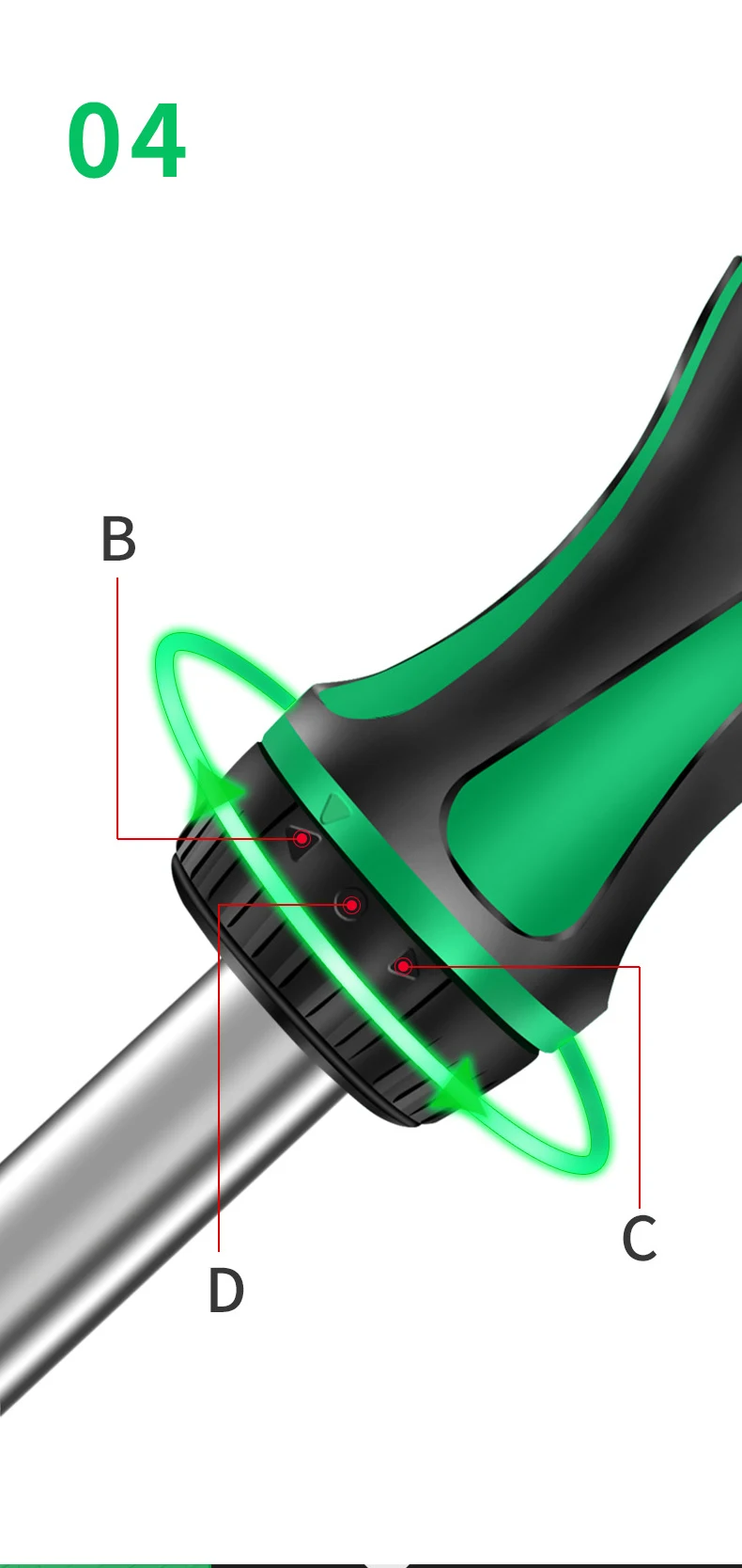B: обратное вращение, трещотка ослабить винт C: вращение вперед, трещотка затягивает винт D: Центральный замок