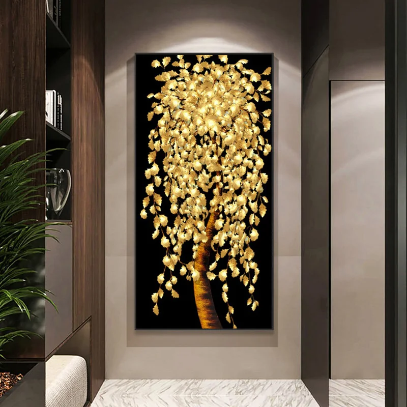 Абстрактная картина маслом на холсте с изображением золотых листьев и денег