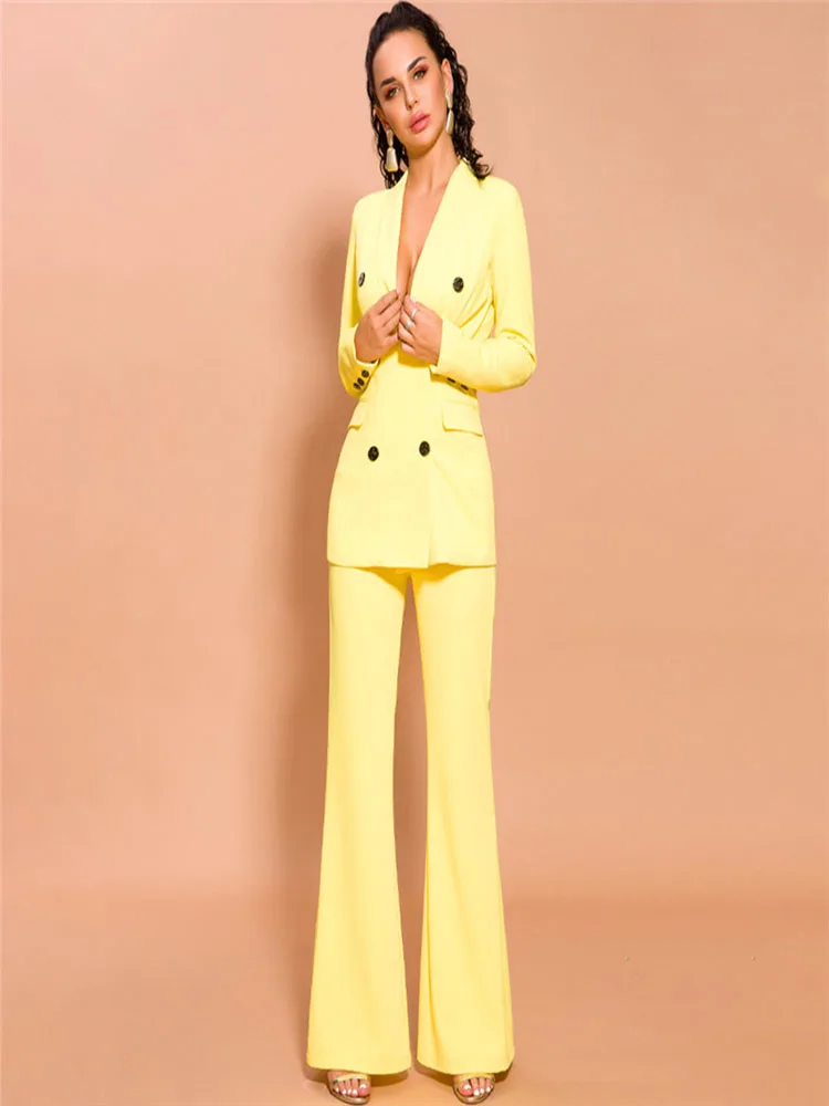 Желтые женские деловые костюмы, двубортные Женские Брючные костюмы из 2 предметов, смокинг для свадебной одежды