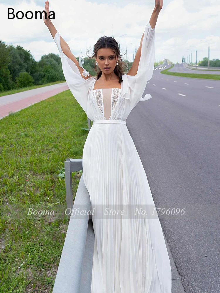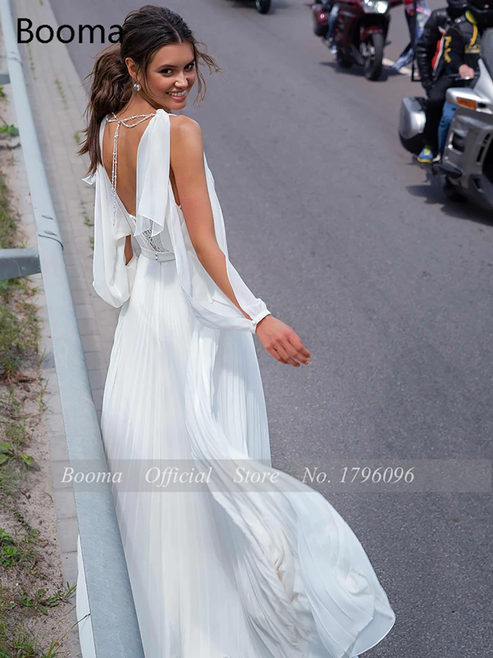 Боома современные пляжные свадебные платья Бохо С Длинным вырезом рукава плиссированные шифоновые платья невесты без бретелек Бисероплетение Кружева Свадебные платья