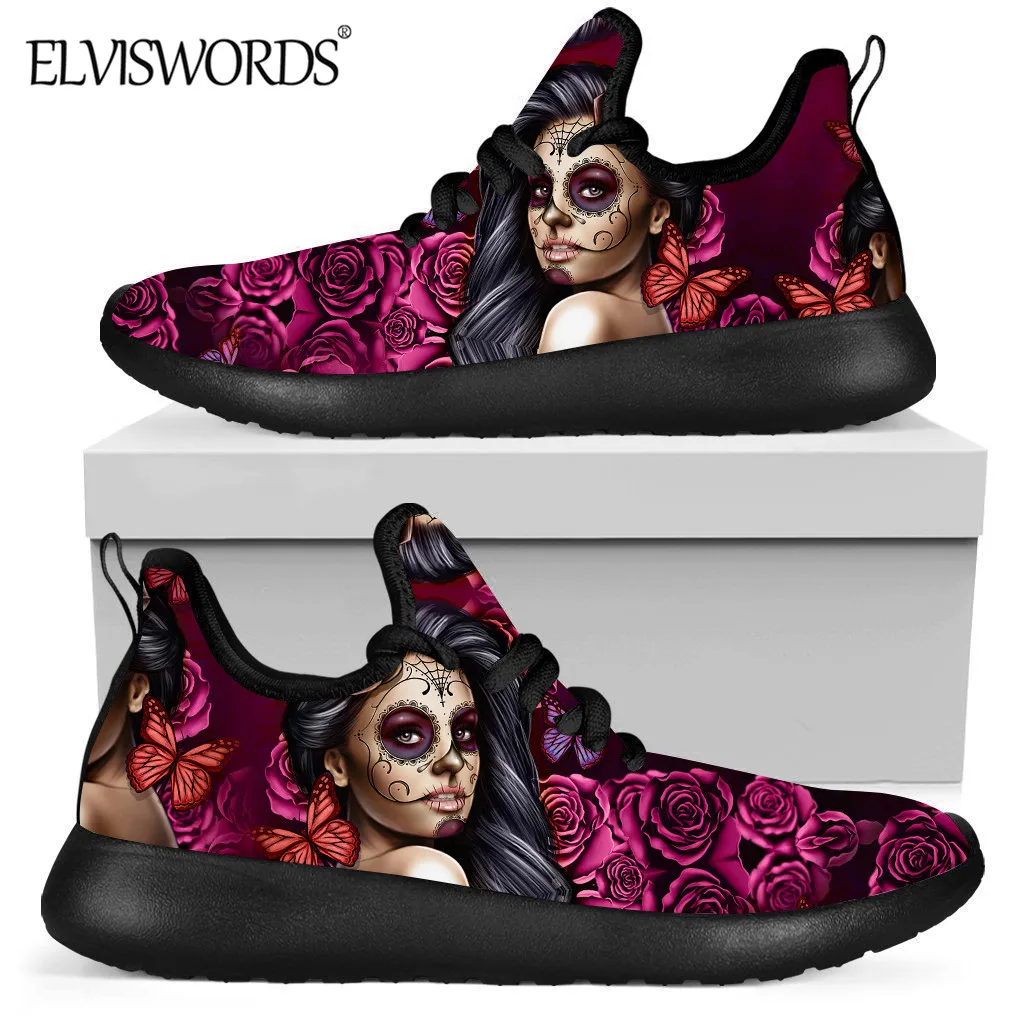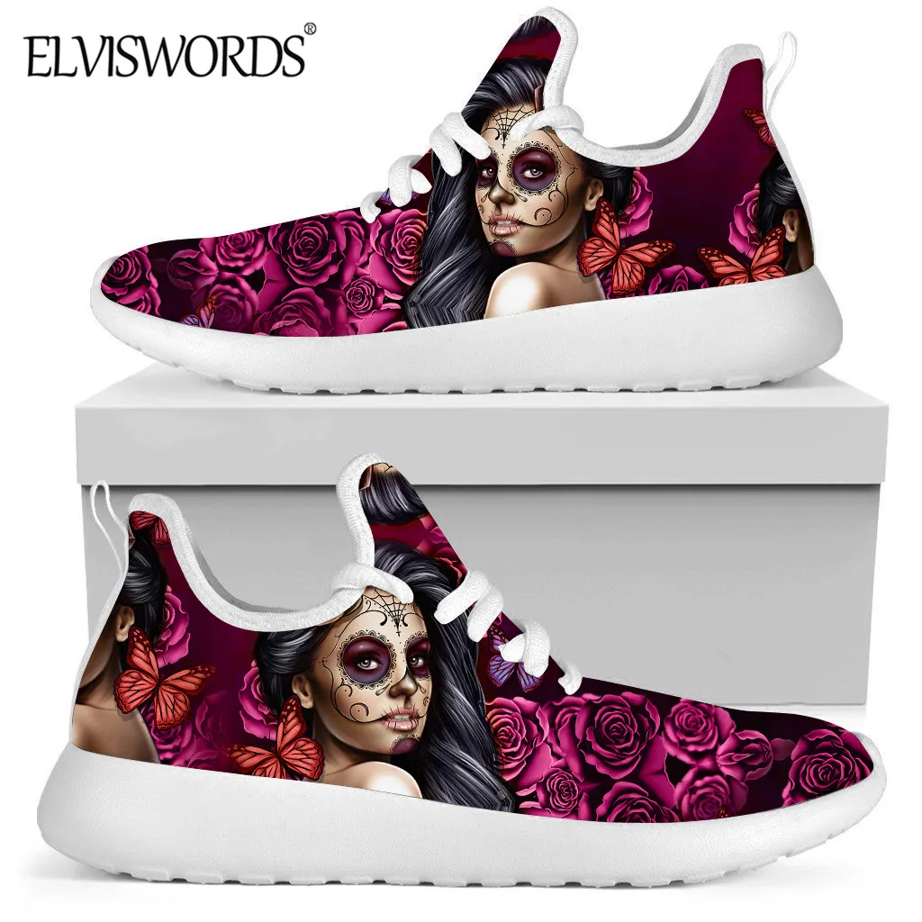 Кроссовки ELVISWORDS женские в готическом стиле, вязаные сетчатые кеды с рисунком черепа и цветов, Повседневная Вулканизированная обувь для девочек-подростков, 2020