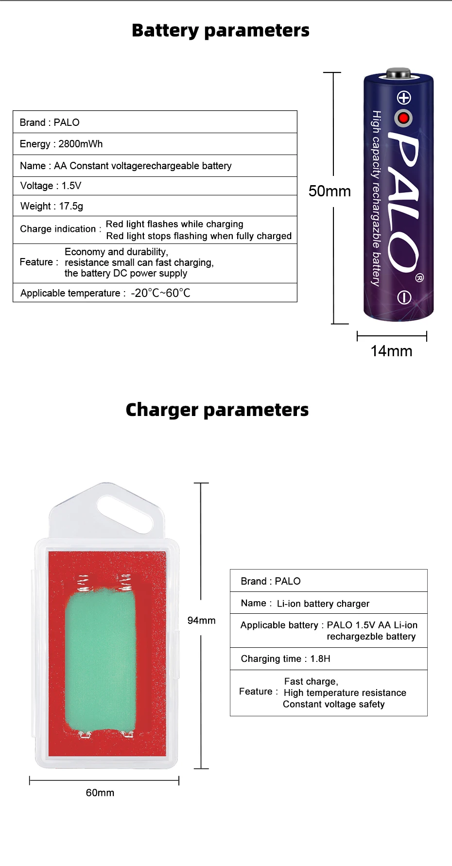 Режим: 1,5 V AA Перезаряжаемые батареяМатериал: литий-ионныйЕмкость: 2800mwhЗарядка: мигает красный светильникОстановка зарядки: Красный светильникПрименимая температура:-20-60 ℃