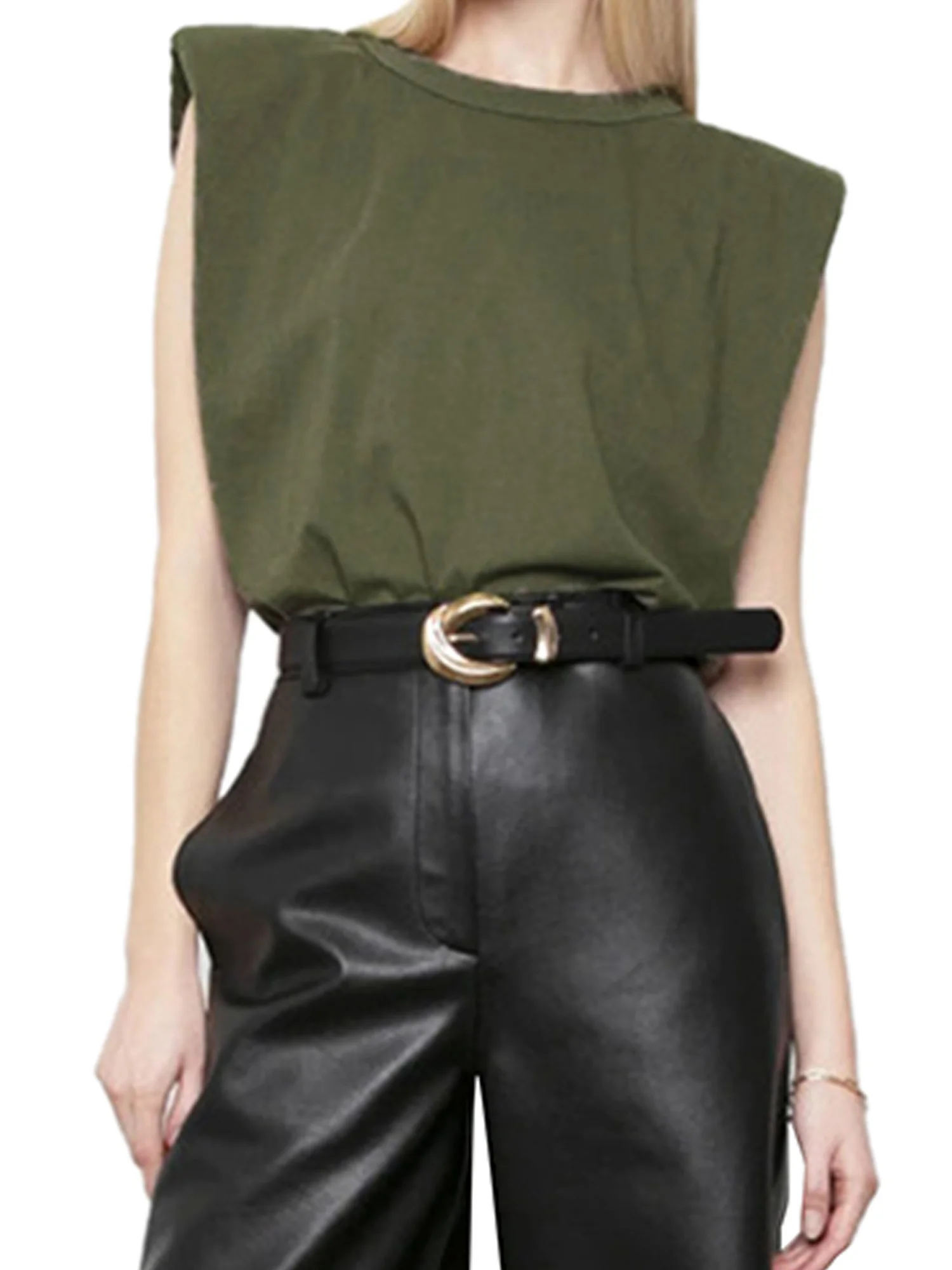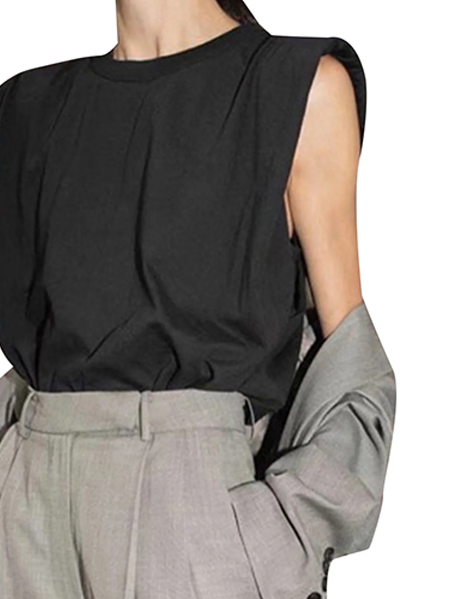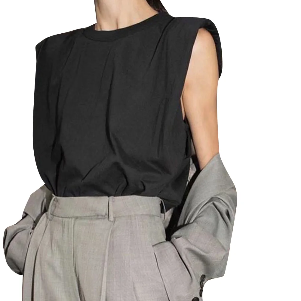 Женские футболки с подкладкой на плечах без рукавов, однотонный топ с круглым вырезом, повседневный стиль, пуловер