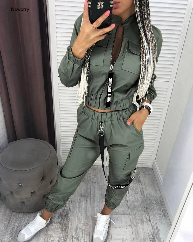Женский спортивный костюм Noworry, из двух предметов, куртка с длинным рукавом и рюшами, с карманами и брюки-карго, для бега