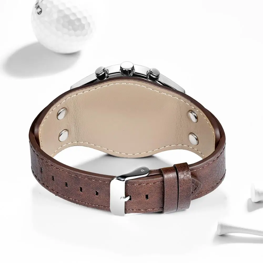 Мужские кварцевые часы с календарем, коричневым кожаным ремешком