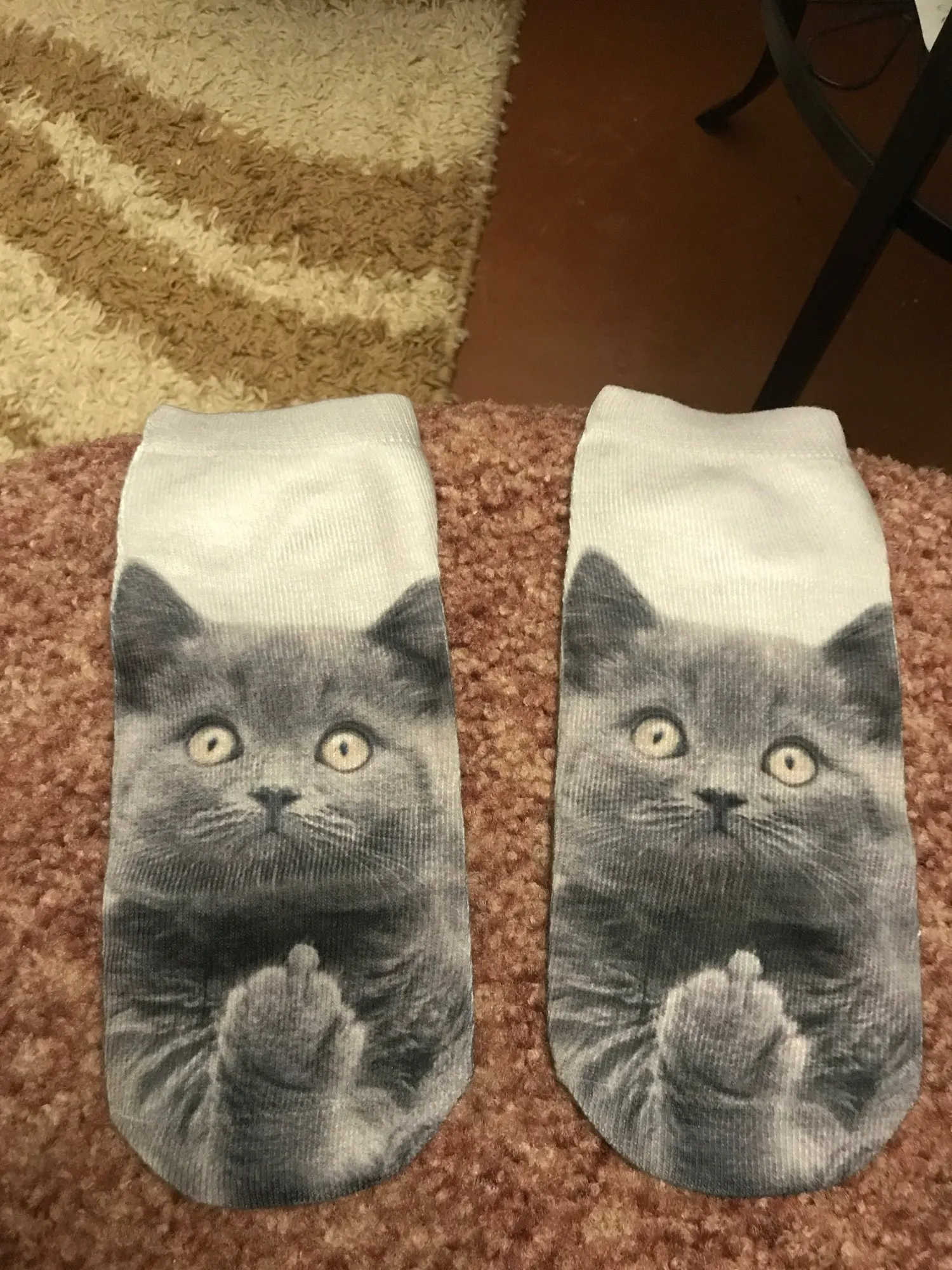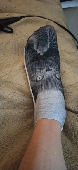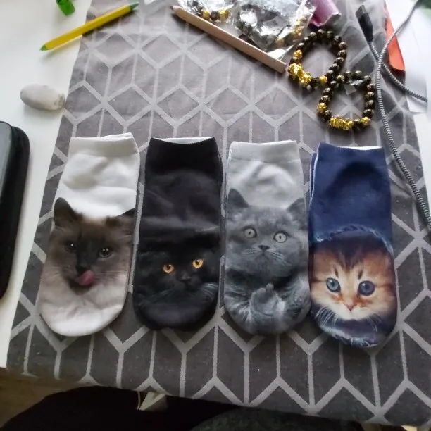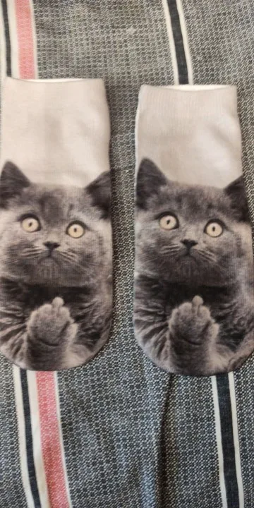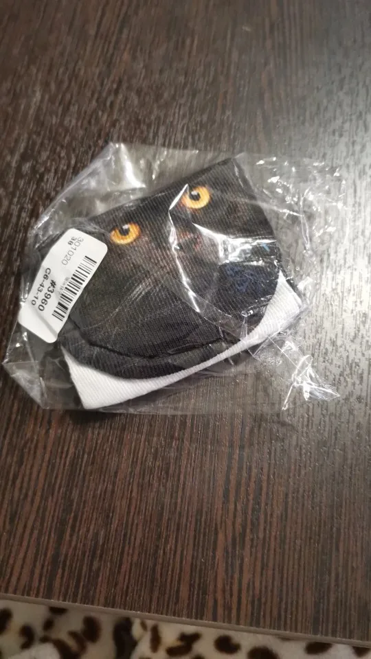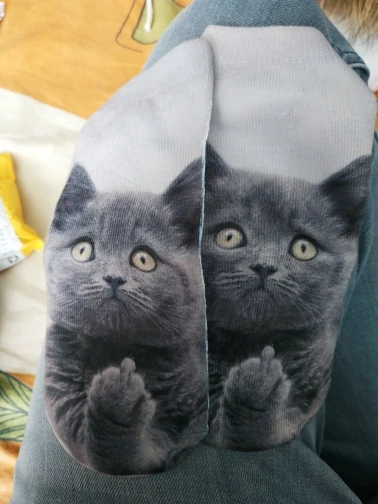 Принт настолько качественный и четкий, что когда вскрывался пакет, я подумала, что к носкам прислали пару котят, чтоб не было скучно долгими зимними вечерами. Кошка стала волноваться, завидев их, а потом сочла братанами и не отходит ни на шаг! Однозначно, 12 из 10 пушистых жоп!