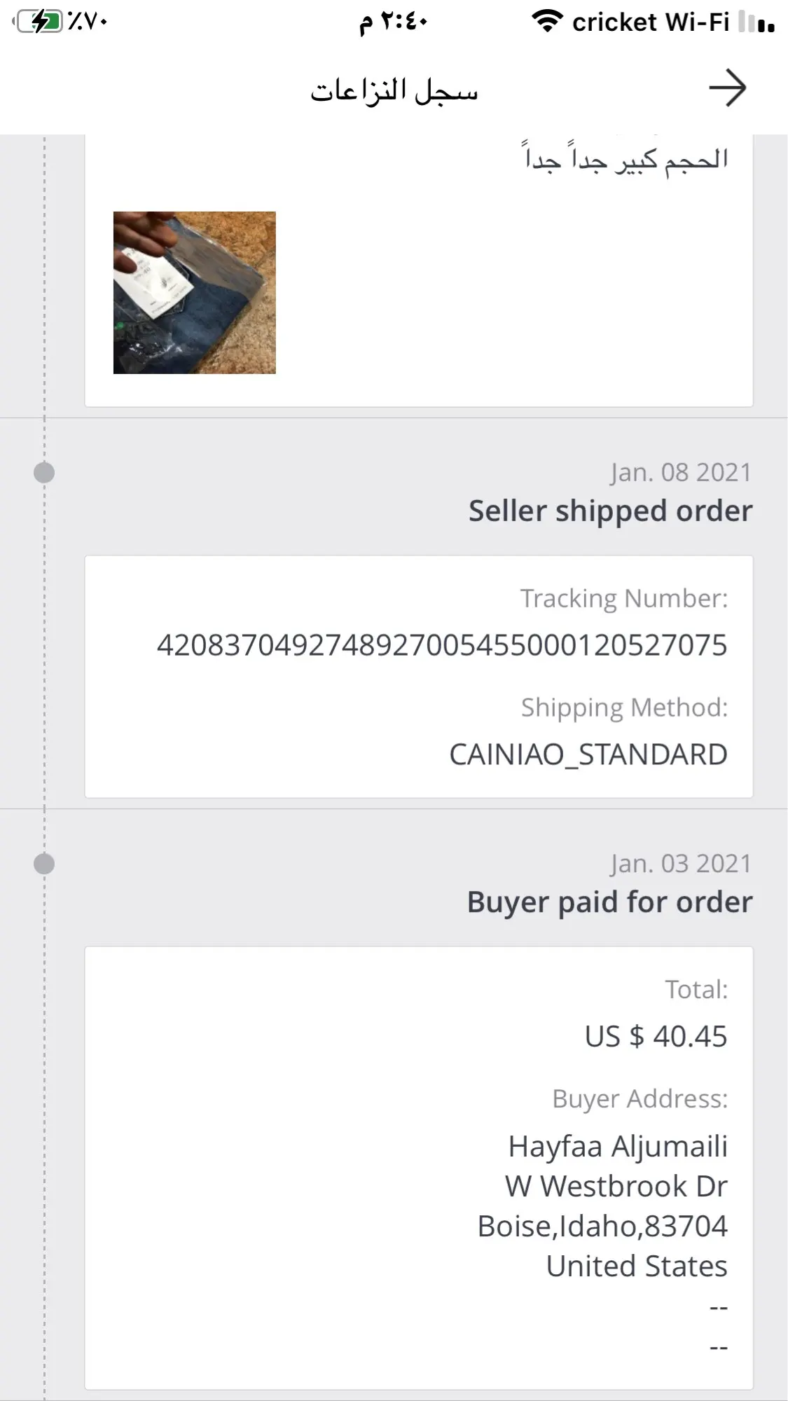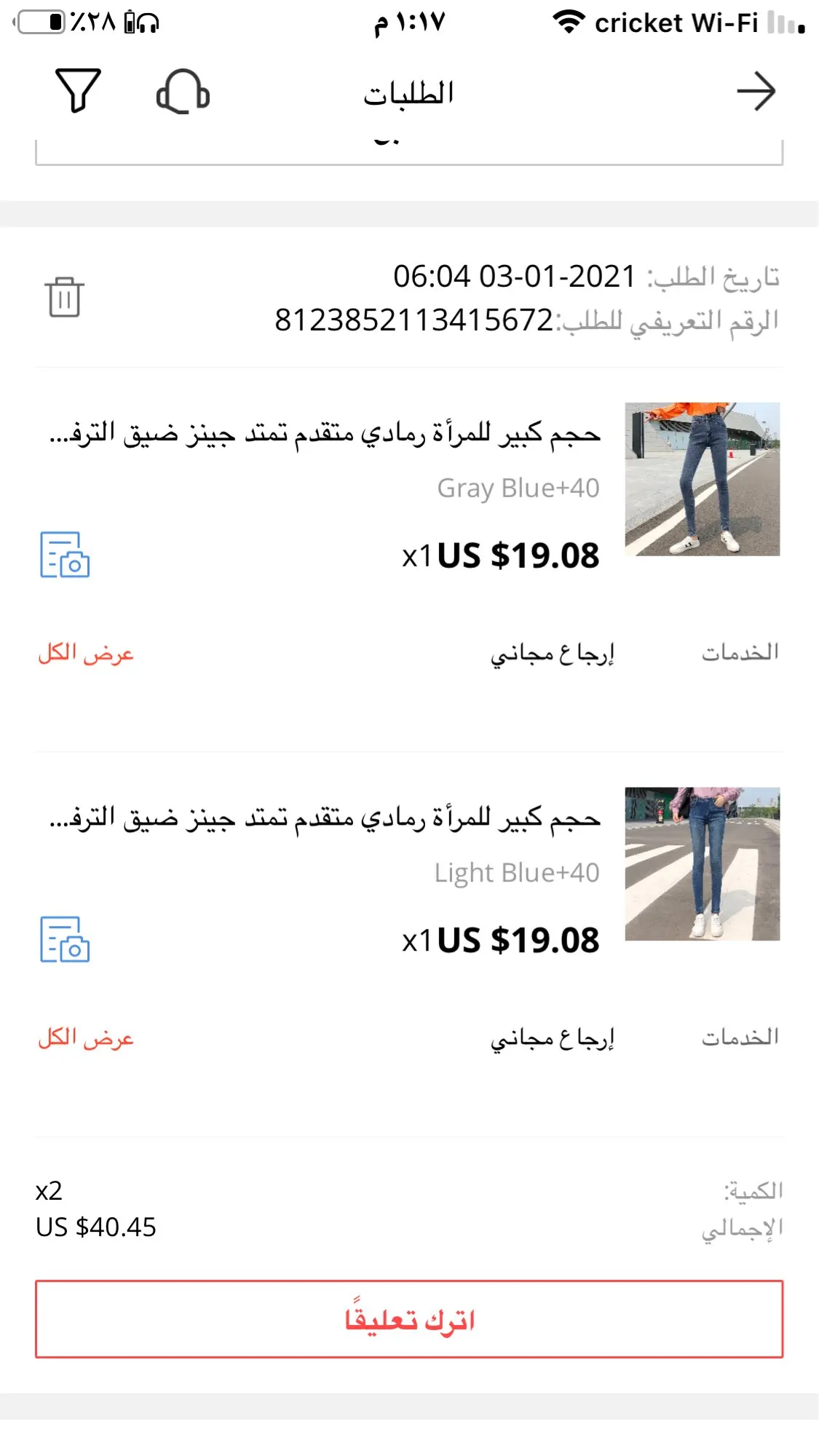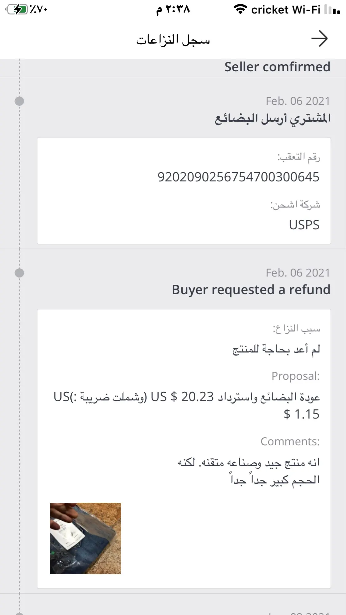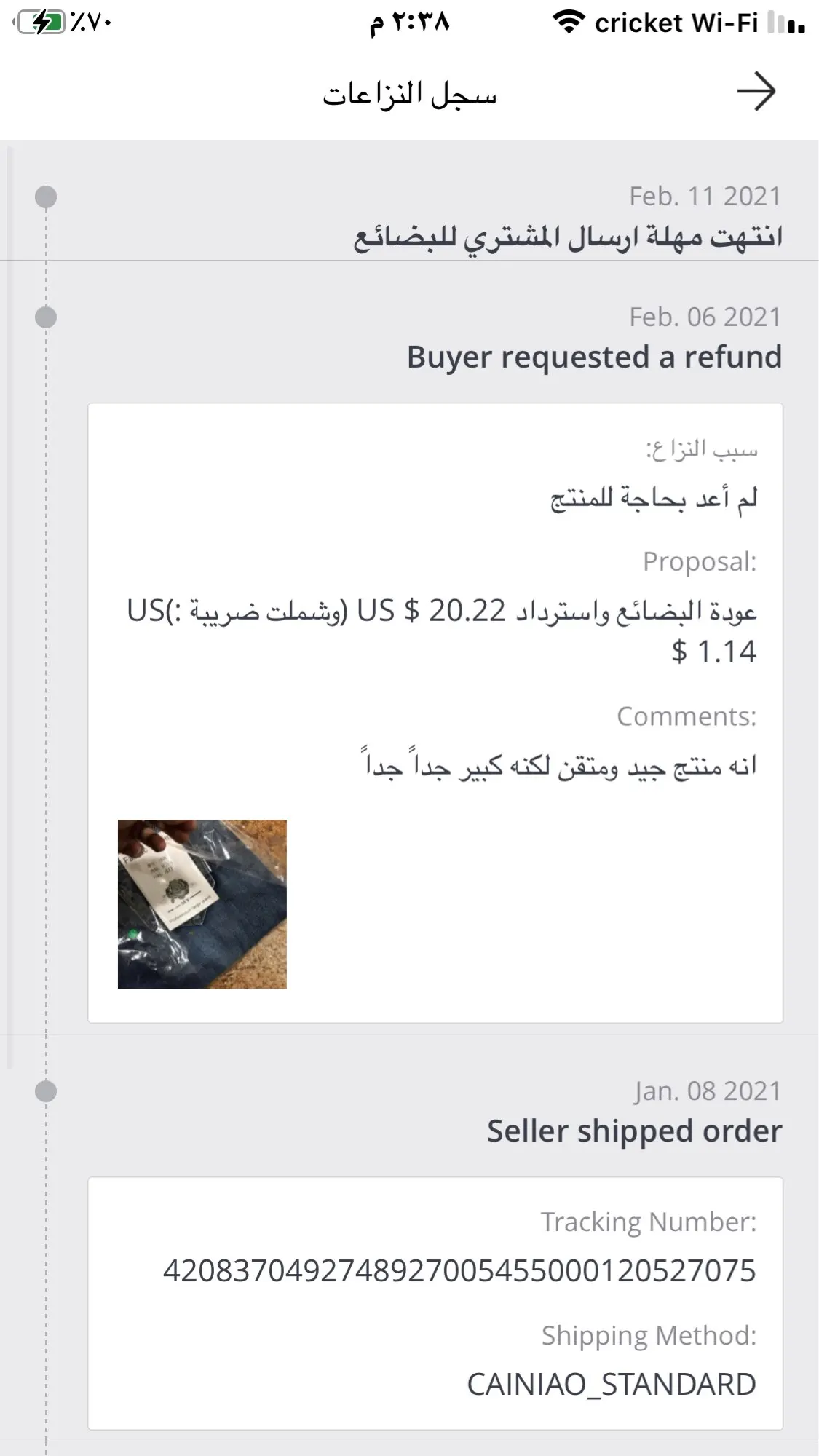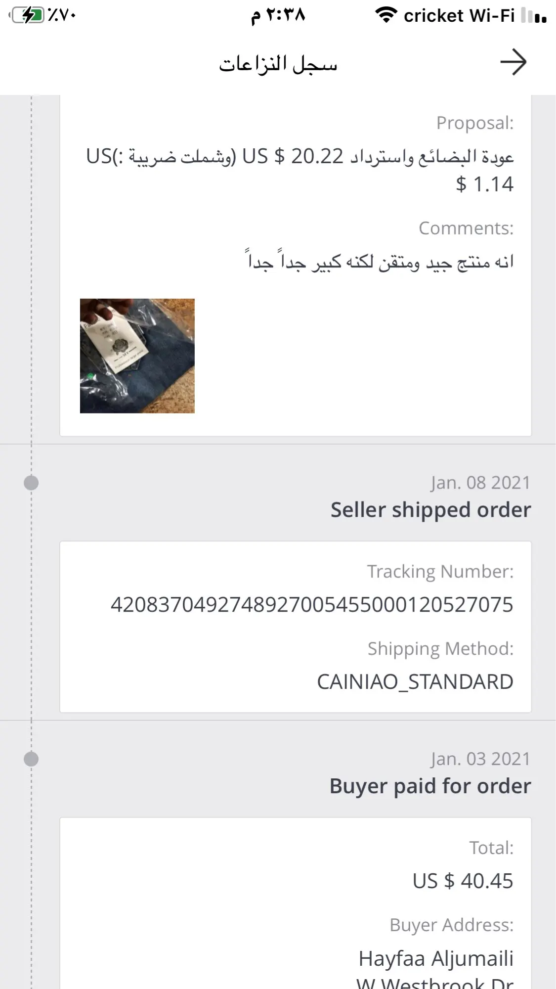 Я купил 2 брюки разных размеров, и они были большими. Поэтому я потребовал возврата, открыв спор и отправив мне карту возврата, и я вернул их вместе, как только получил их. Но только одни брюки были возвращены. Я не знаю почему. Почему остальные деньги не возвращаются ко мне? Оба были отправлены вместе. Я требую полный возврат средств.