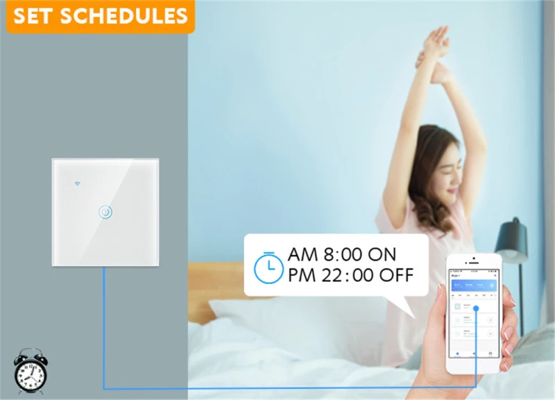 【Timing】 умный переключатель автоматически включается и выключается в данный момент времени через функцию таймера. Выберите время, когда вы хотите проснуться, автоматически Откройте светильник, чтобы вы могли легко войти в день; Выберите время, которое вы хотите закрыть светильник.