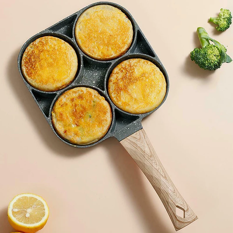 Сковорода для омлета с 4 отверстиями для приготовления бургеров, яиц, ветчин, блинов, деревянная ручка, антипригарное устройство для жарки завтрака, индукционная плита, 1 шт.