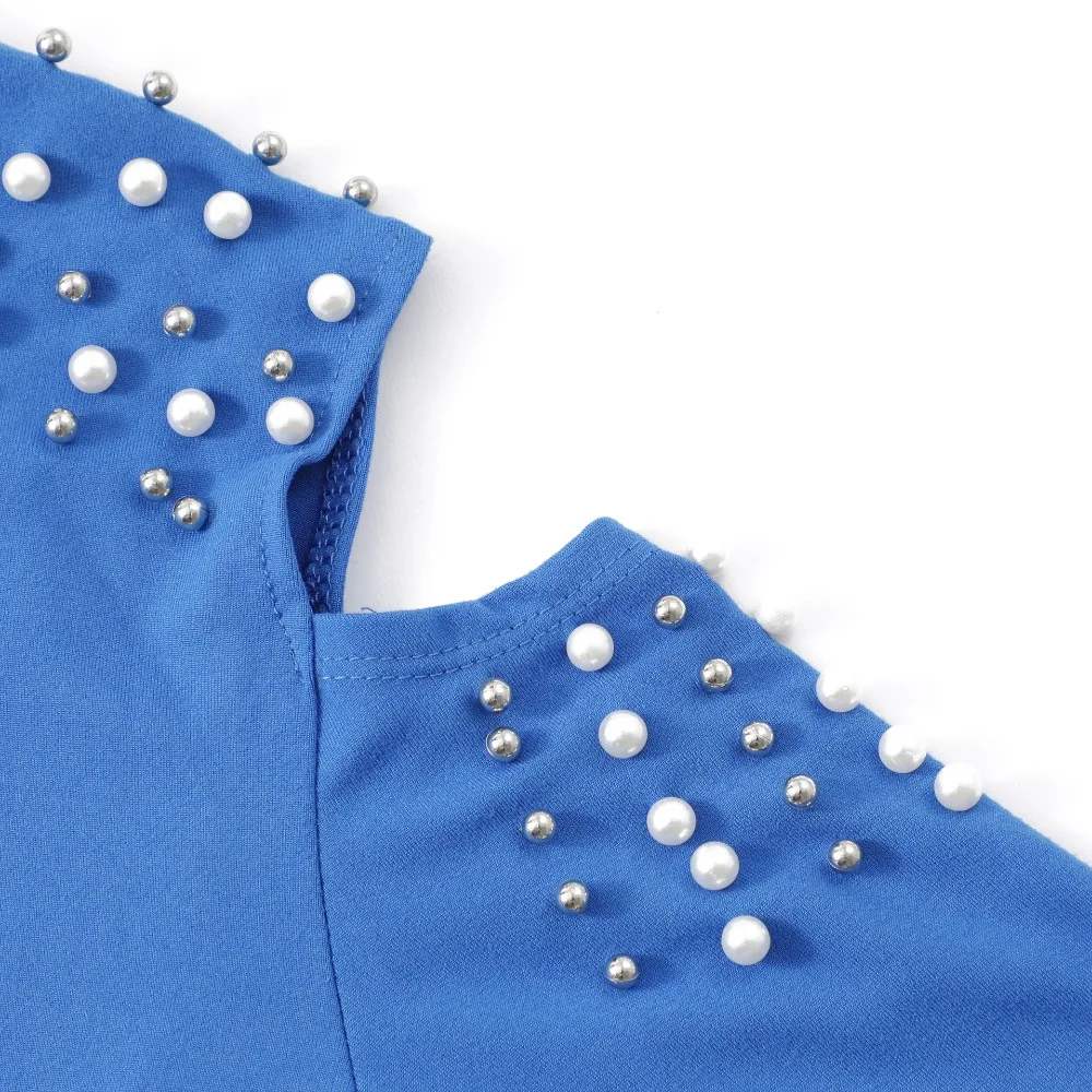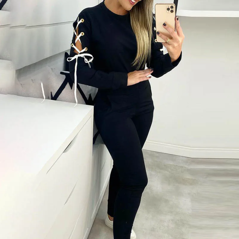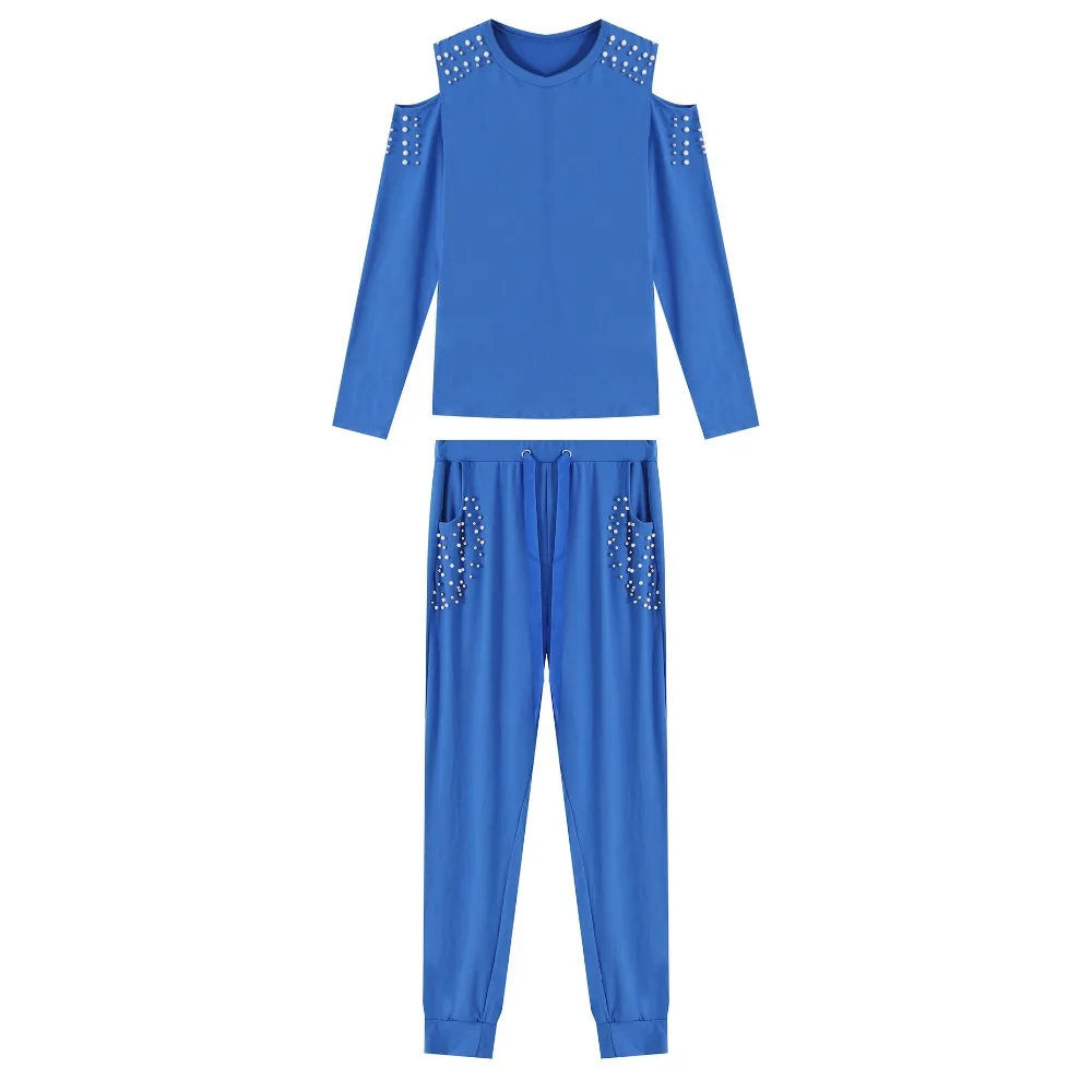 Женский спортивный костюм на сезон осень-зима, комплект из двух предметов: обтягивающие брюки с высокой талией и бусинами и длинным рукавом, дропшиппинг