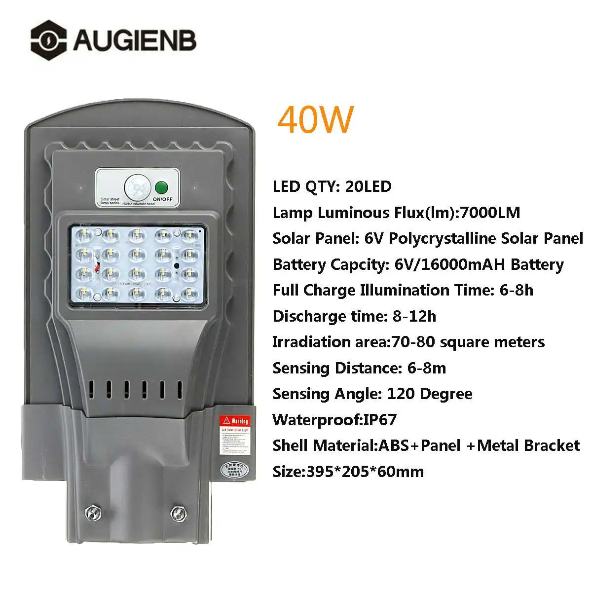 AUGIENB 40WСолнечный уличный светильник20LEDСолярные наружные фонари IP67Водонепроницаемый солнечный светильник с датчиком движения от заката до рассвета, светильник безопасности для двора, сада, улицы, баскетбольной площадки, желоба