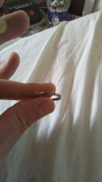 Тонкое кольцо, чем я ожидала, и маленькое имя и неразборчивая Дата маленького размера, немного поцарапанное по бокам имени