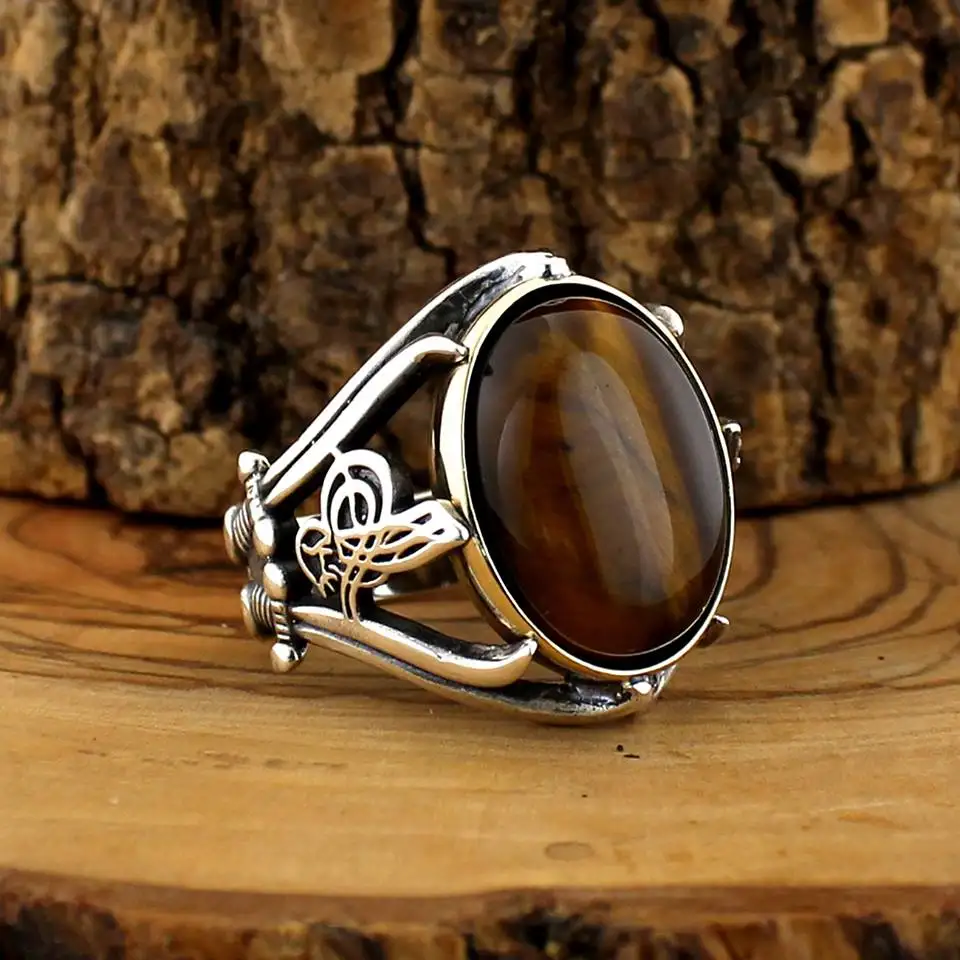 Мужское кольцо из серебра 925 пробы, с натуральным тигровым глазом