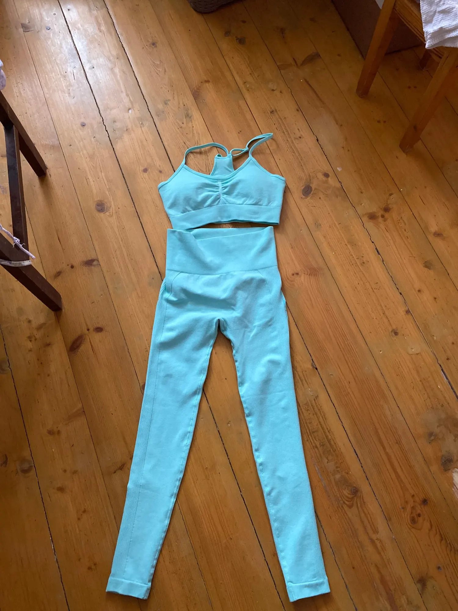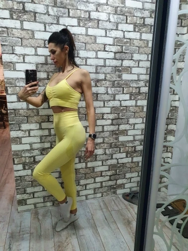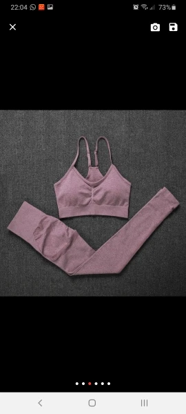 Доставка 2 недели. Костюм прикольный, для зала в самый раз. Высокая талия, хорошая резинка. Топ, непонятно с брителями, зачем такие длинные, тонкие, путаются и при занятиях со штангой явно сломается пласмасовый крепёж, неудачное сочетание... В целом костюм хороший внесли бы не лямки у топа. Цвет как на фото продавца. Доведу до ума и в зал)