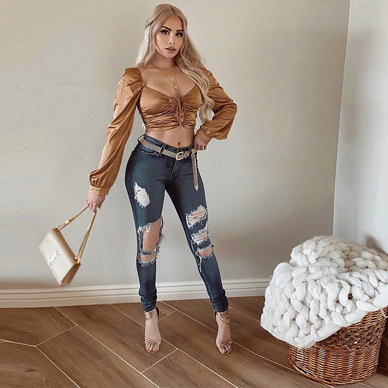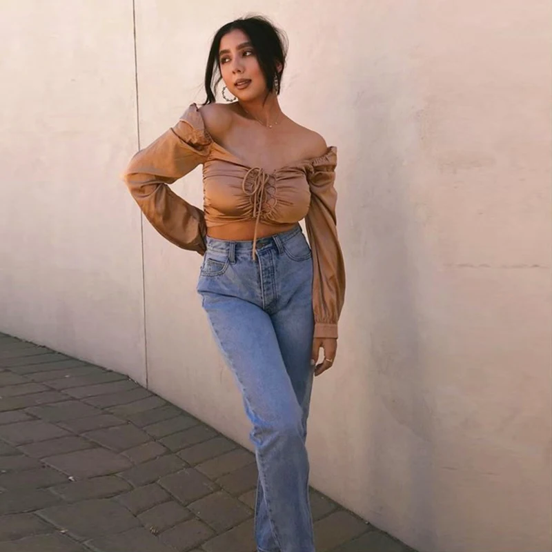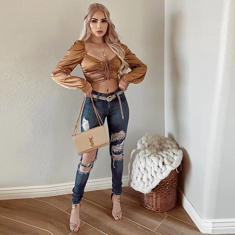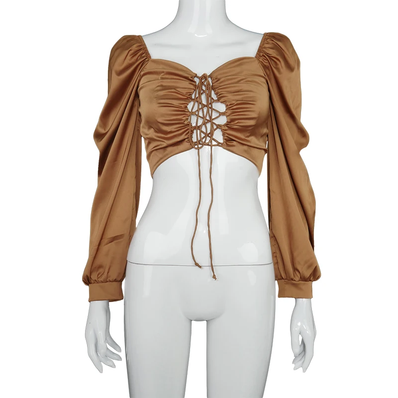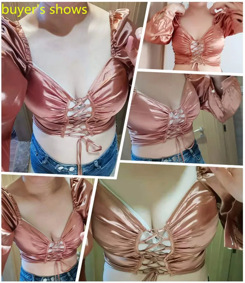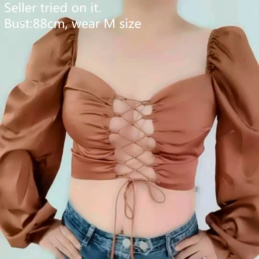 Блузка женская однотонная с пышными рукавами, Модный бандажный топ ...