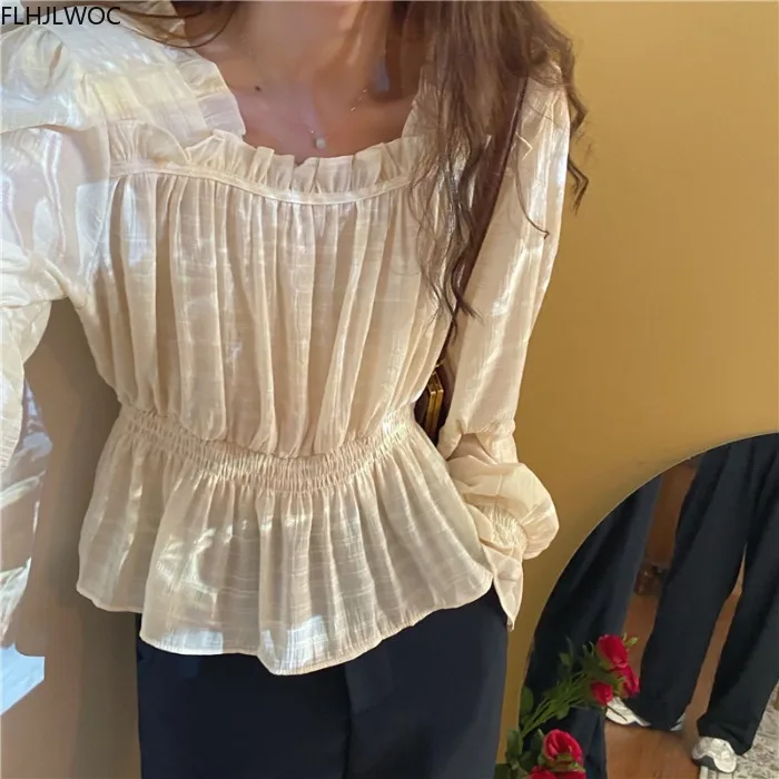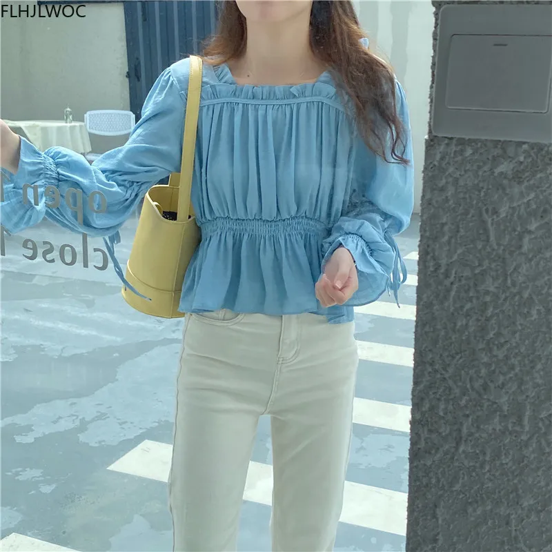 Осень 2020, Новое поступление, топы с расклешенными рукавами и баской, милые однотонные белые рубашки в японском стиле, 0828