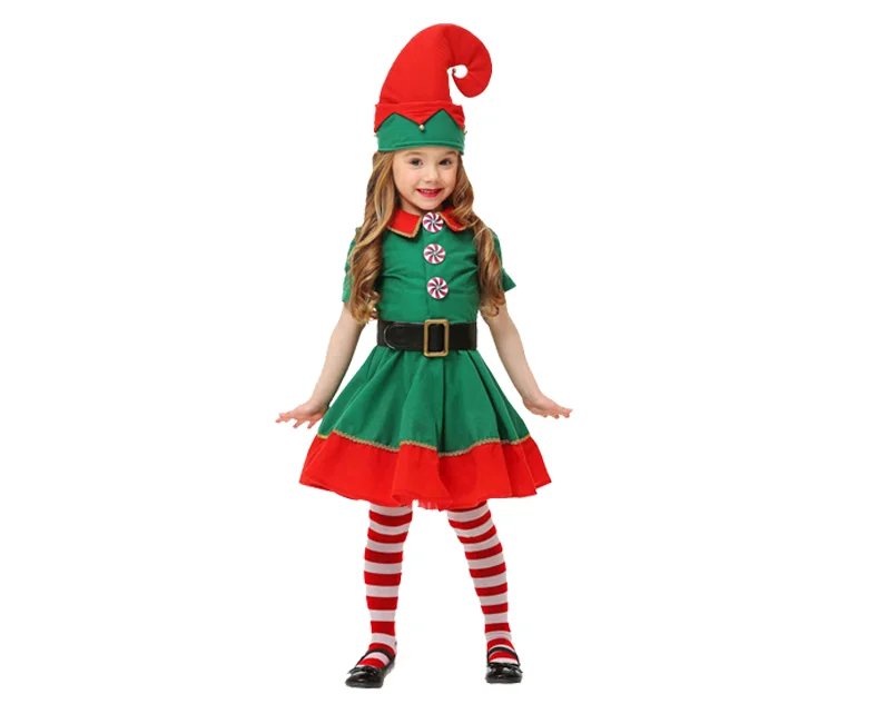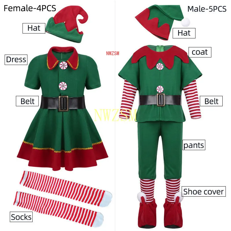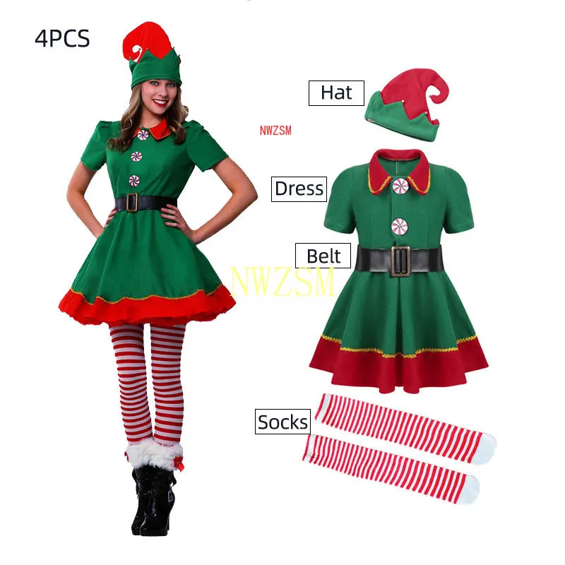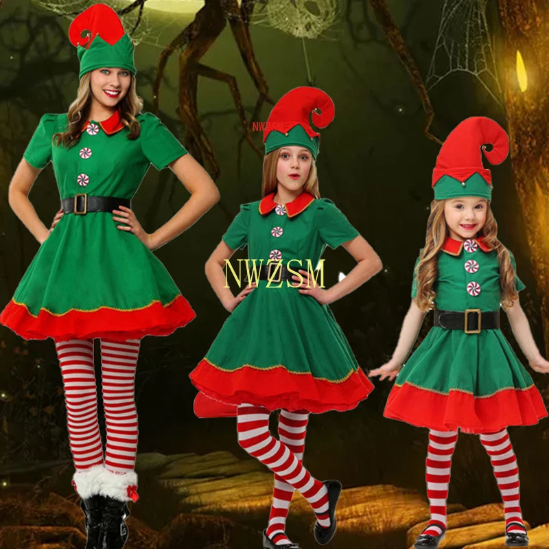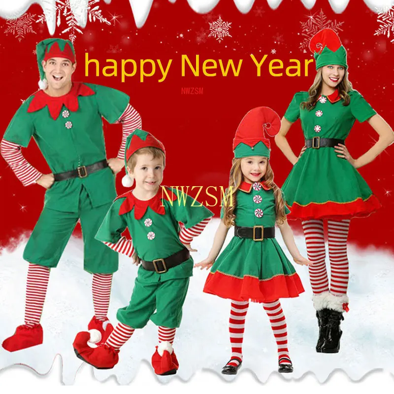 Рождественский костюм Санта-Клауса для мужчин, женщин, девочек, мальчиков, костюм зеленого эльфа для косплея, семейная Рождественская вечеринка, новогоднее маскарадное платье, комплект одежды для