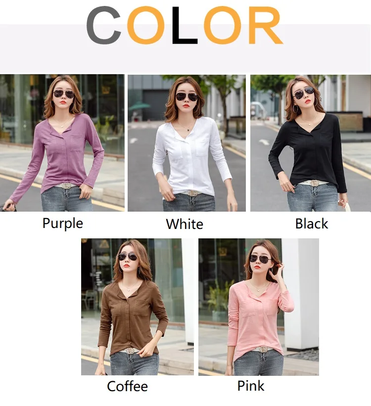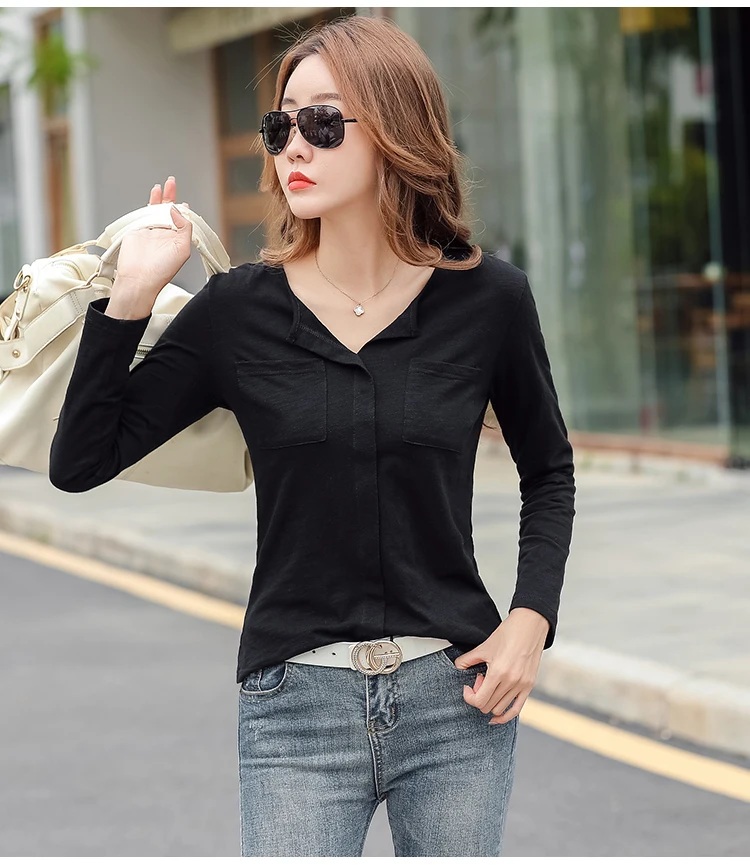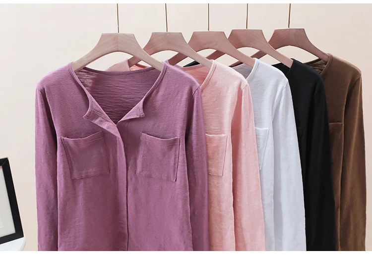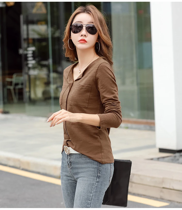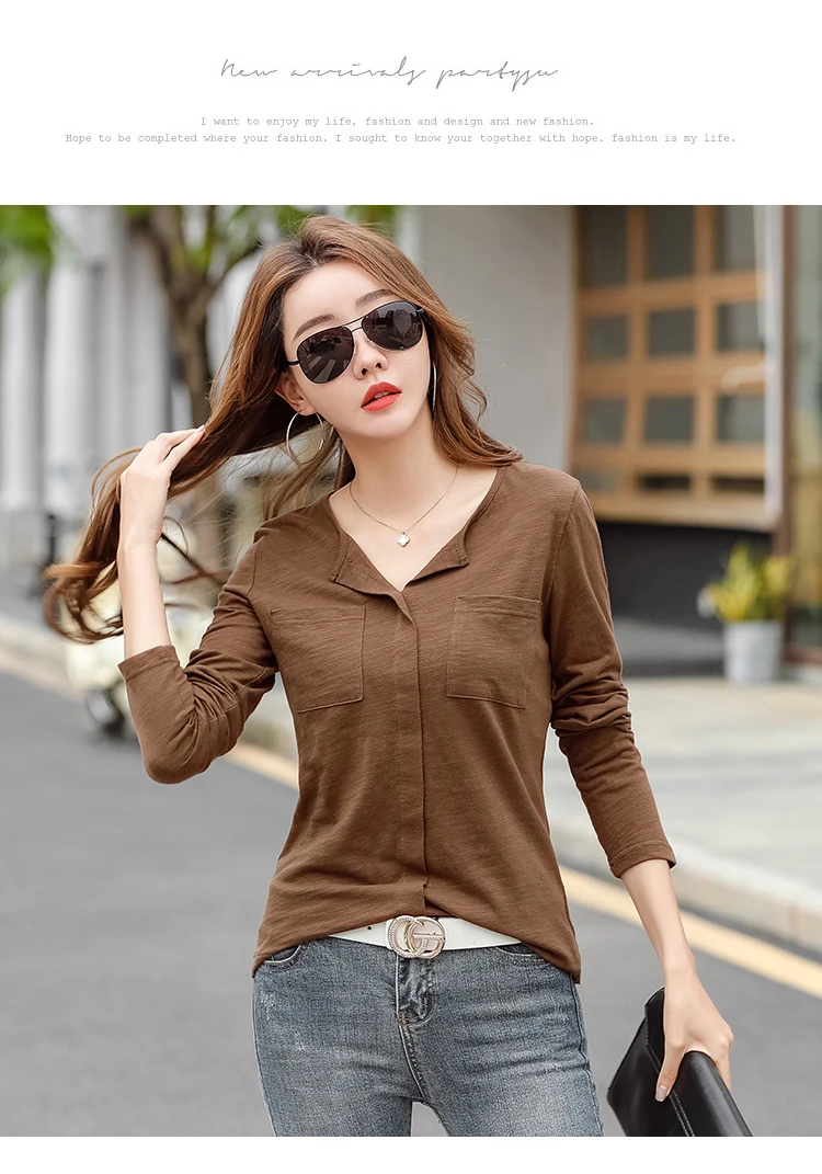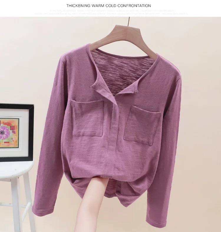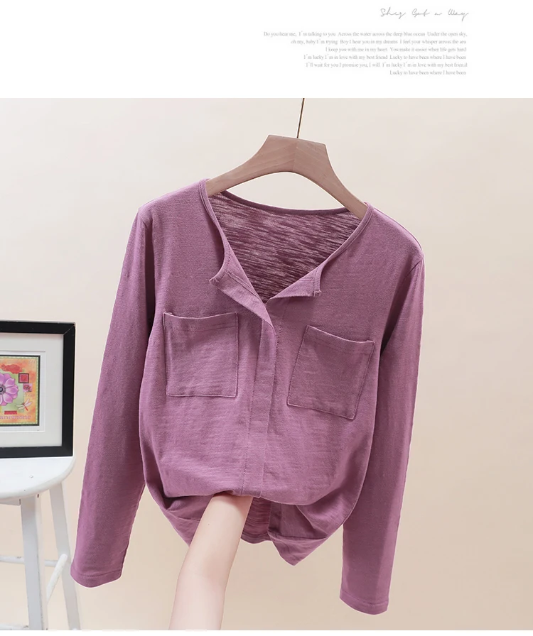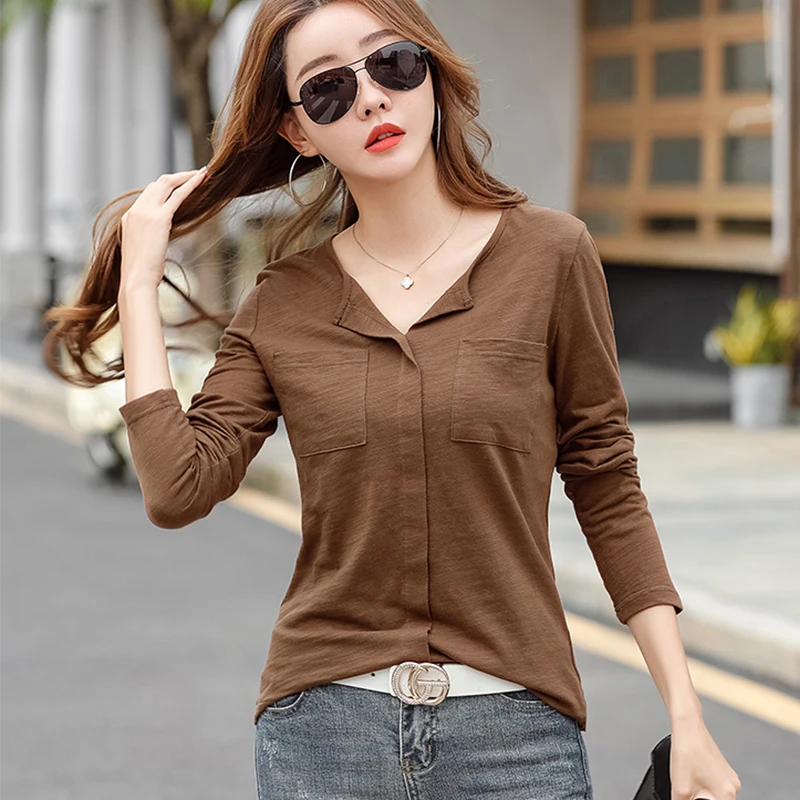 Повседневные футболки TuangBiang из 2022 хлопка с двумя карманами и V-образным вырезом, Женская Весенняя футболка с длинным рукавом, кофейно-фиолетовая футболка, Женские однотонные Топы