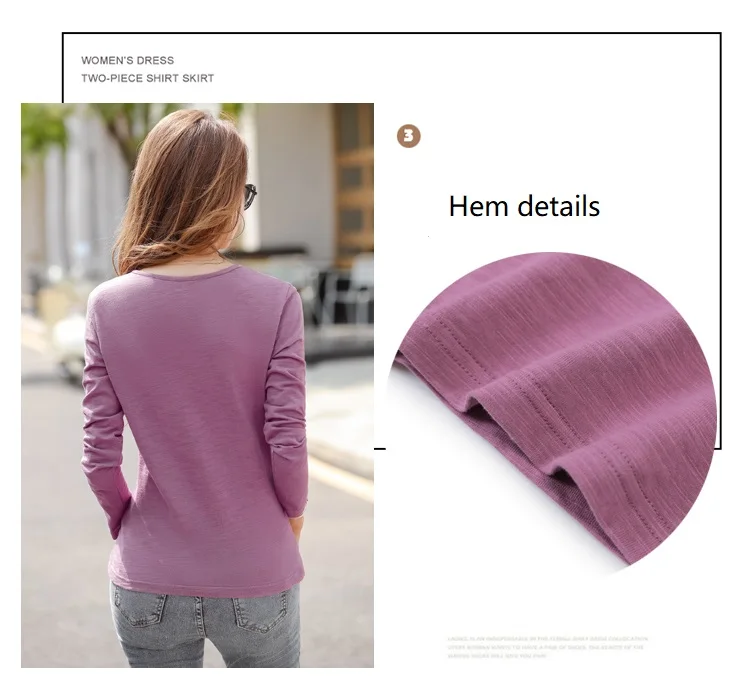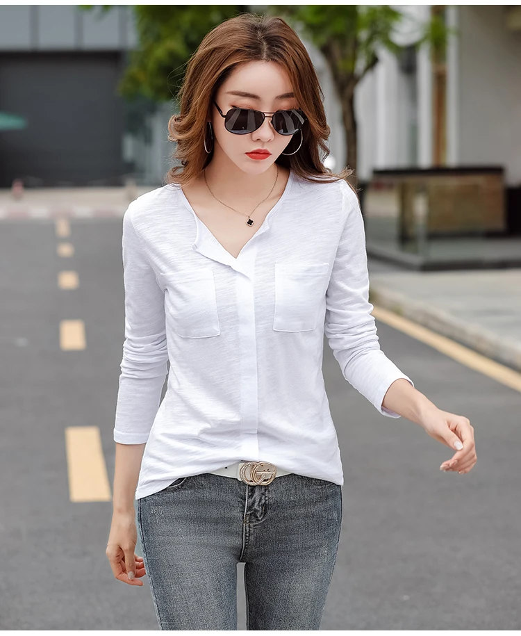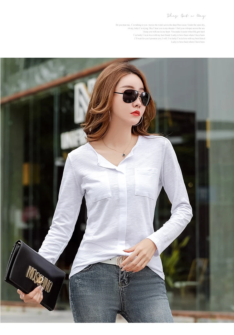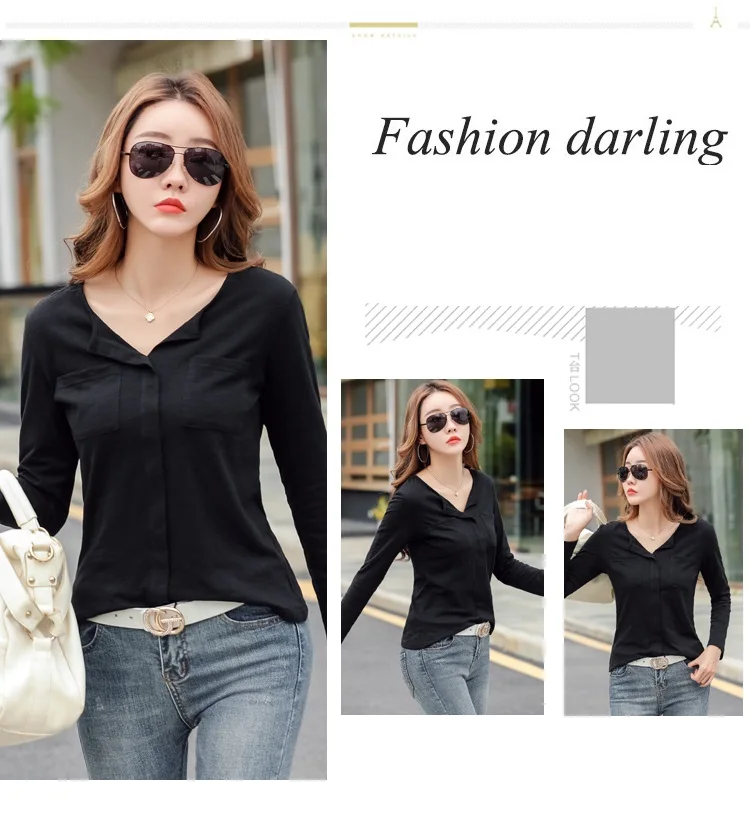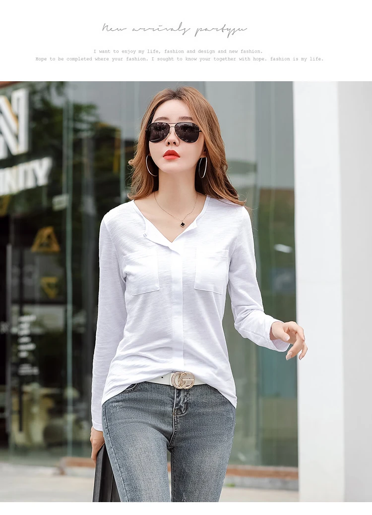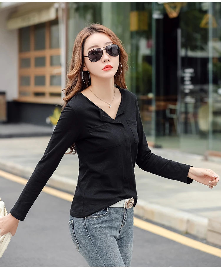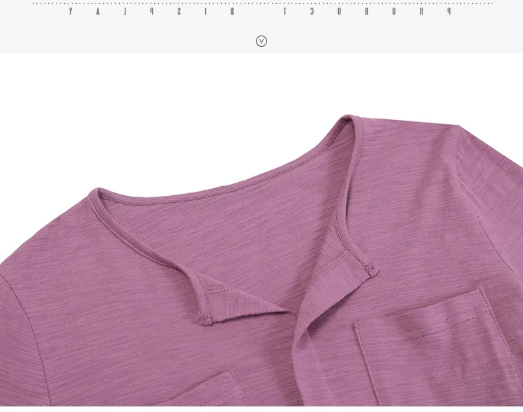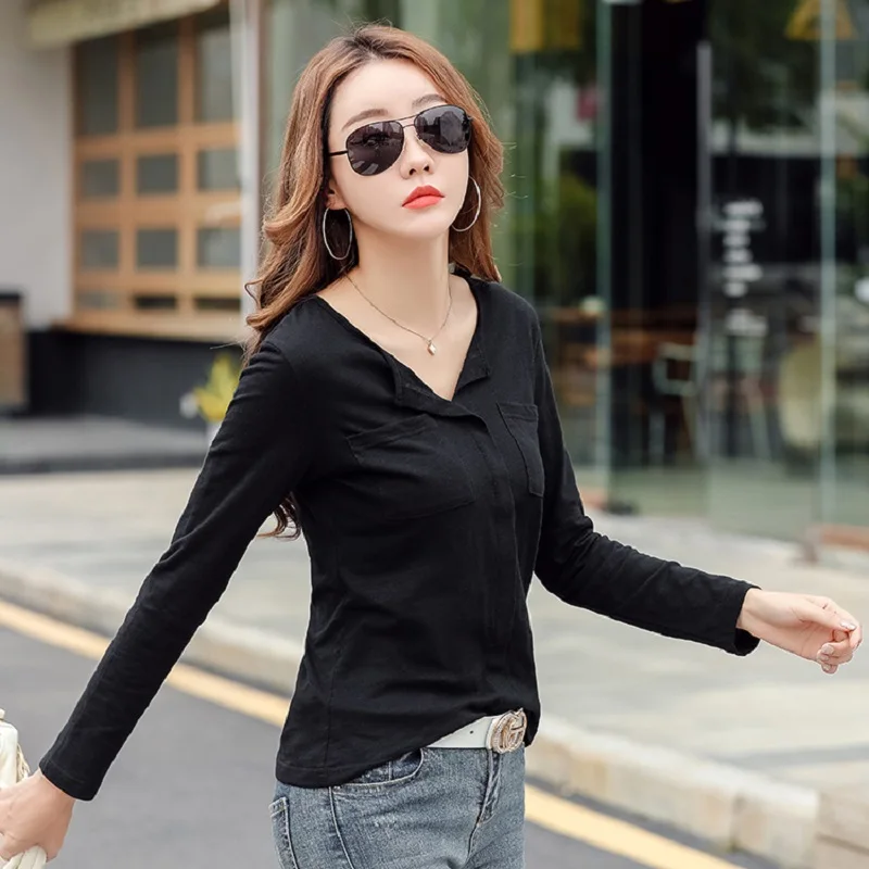 Повседневные футболки TuangBiang из 2022 хлопка с двумя карманами и V-образным вырезом, Женская Весенняя футболка с длинным рукавом, кофейно-фиолетовая футболка, Женские однотонные Топы