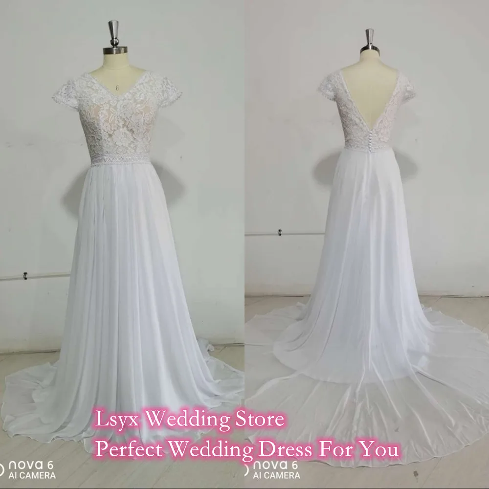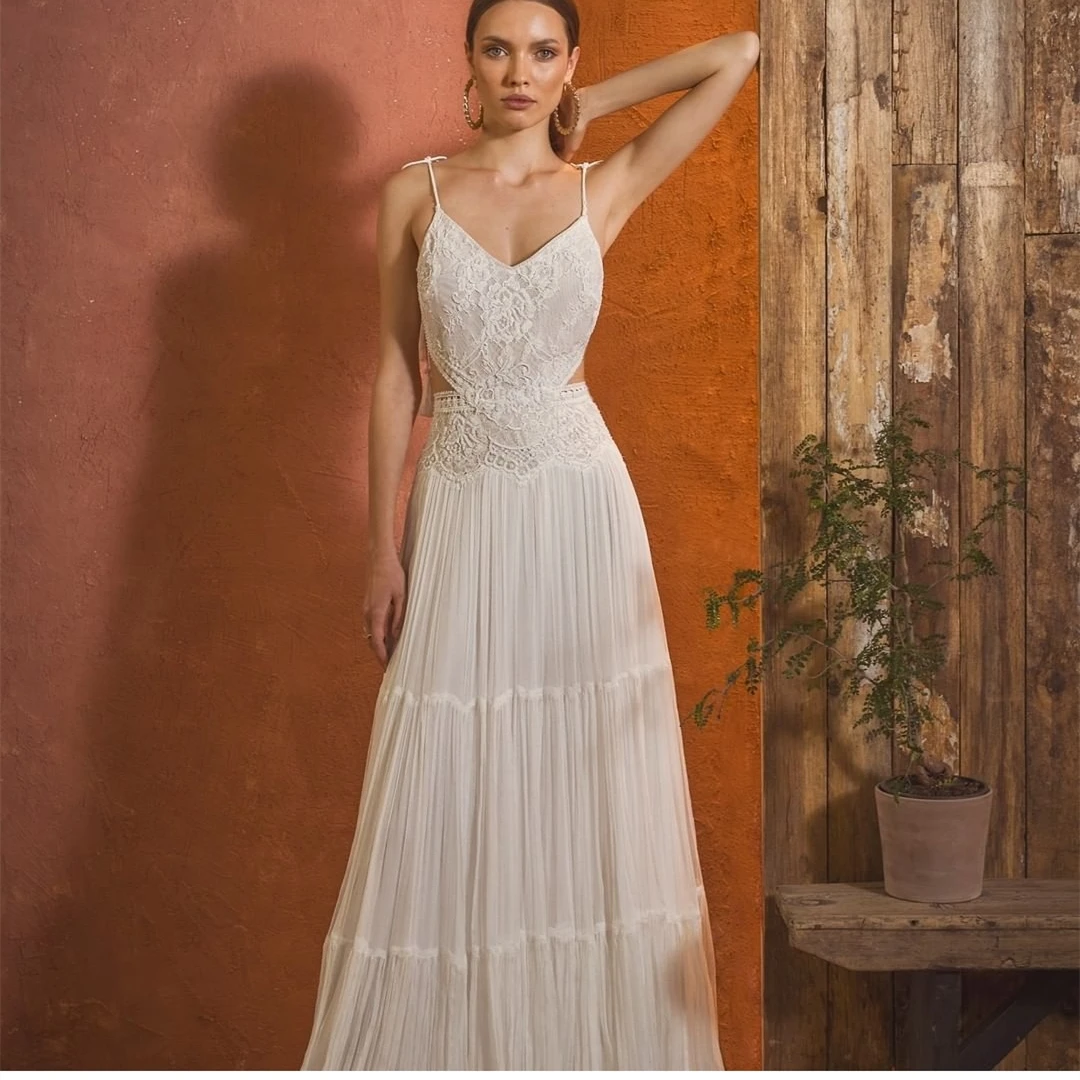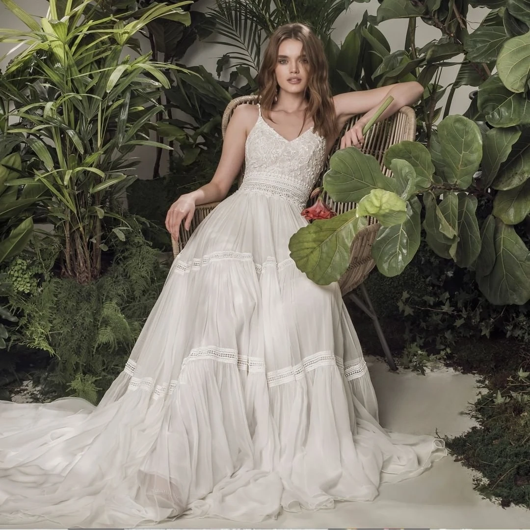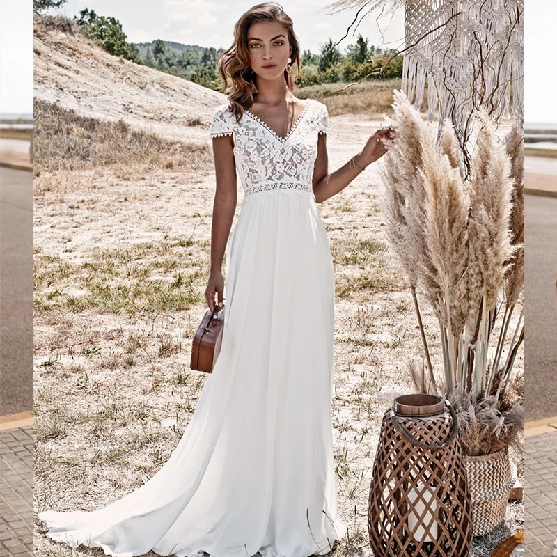 Винтажное кружевное богемное свадебное платье Boho 2021 ТРАПЕЦИЕВИДНОЕ простое пляжное свадебное платье из шифона длиной до пола с v-образным вырезом и шлейфом с открытой спиной