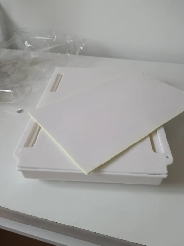 Прилагается большой лист двухстороннего скотча, крепить можно на 4 самореза по углам. Но я добавил в середине ещё два со шляпками в потай, чтобы лоток за них не цеплял. Присутствует запах.