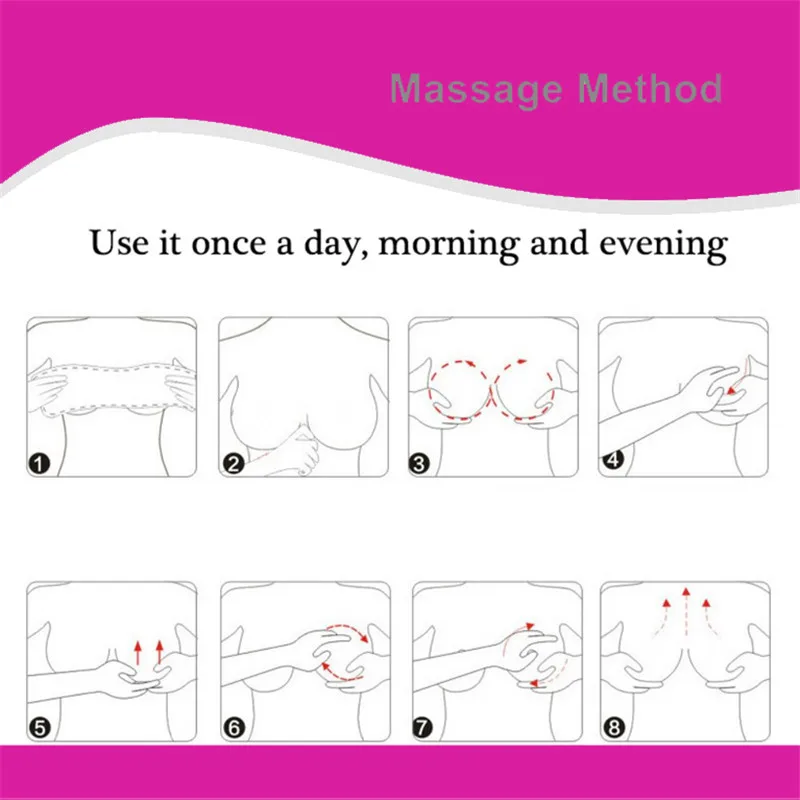 После очищения, нанесите правильное количество этого продукта мягко вокруг груди, снова с кончиками пальцев от вниз до вверх, массируйте грудь снаружи, чтобы нажать на технику подъема, мягко массируйте грудь, продвигайте продукты, полностью поглощаемые. Горячая вода ванна (или полотенце горячий компресс) после использования, эффект лучше. Используйте его один раз в день или в салоне красоты для профессионального ухода.