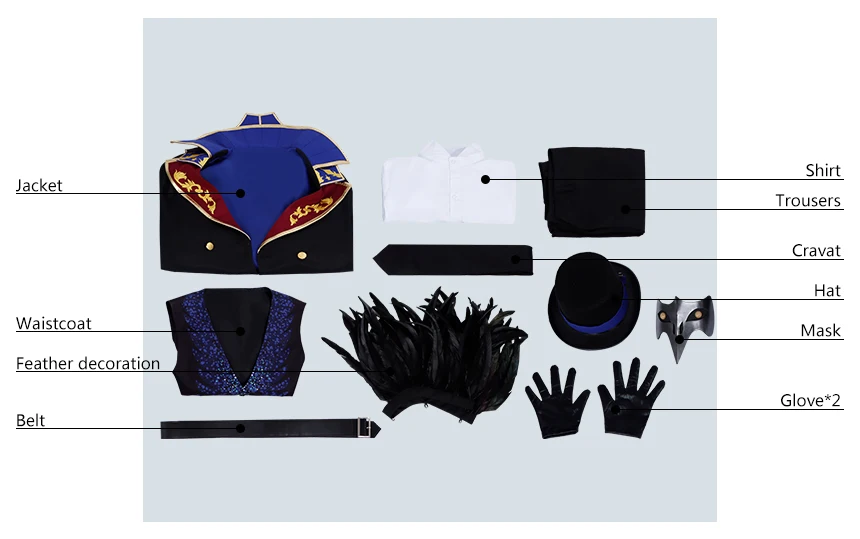 Куртка, жилет, рубашка, брюки, пояс, украшение из перьев, шляпа, маска, перчатки, галстук.