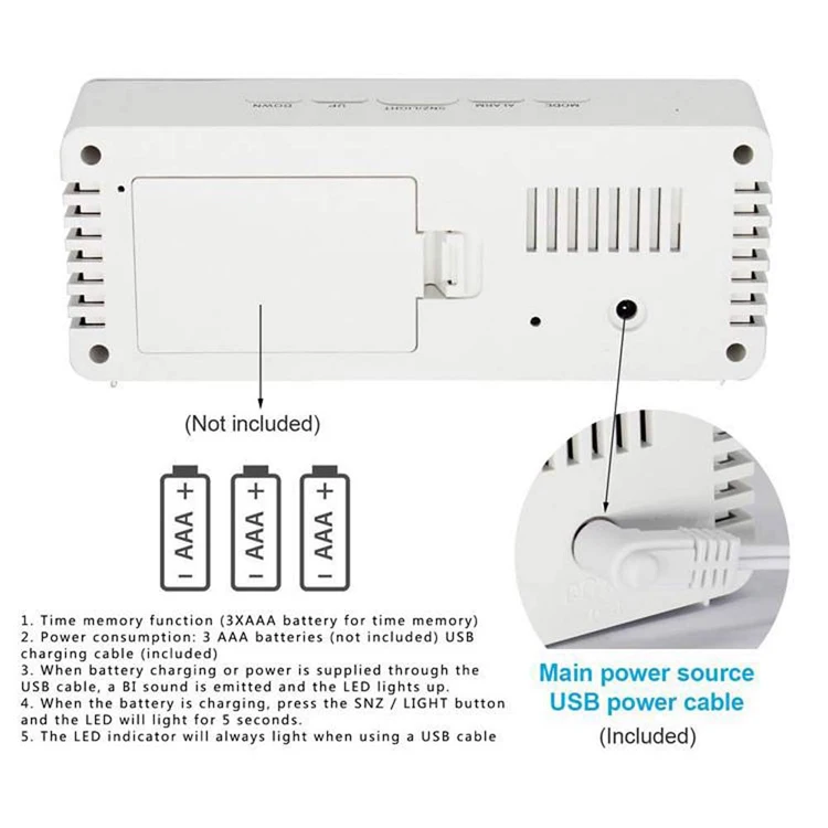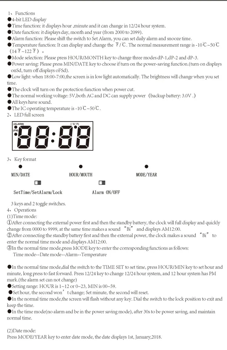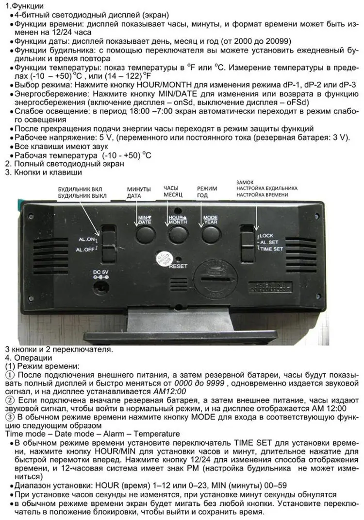 В описании ошибка. Для резервного питания используются не 3 батарейки «ААА», а одна «2032». Впрочем, это видно на фотографии – вид сзади. В остальном претензий к часам нет. Цифры большие, светят ярко. Настройка не сложная. Нужно только один раз разобраться. Пока не понял: чем различаются режимы «dp2» и «dp3», и можно ли отключить ночной режим. Но это не критично. Посылка пришла быстро. Упаковка достаточная. Ничего не помялось, не сломалось.