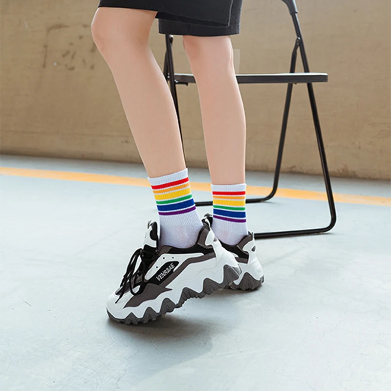 Модные яркие цветные полосатые женские носки, хлопковые осенне-зимние женские повседневные удобные длинные носки, носки без пятки, Chaussette