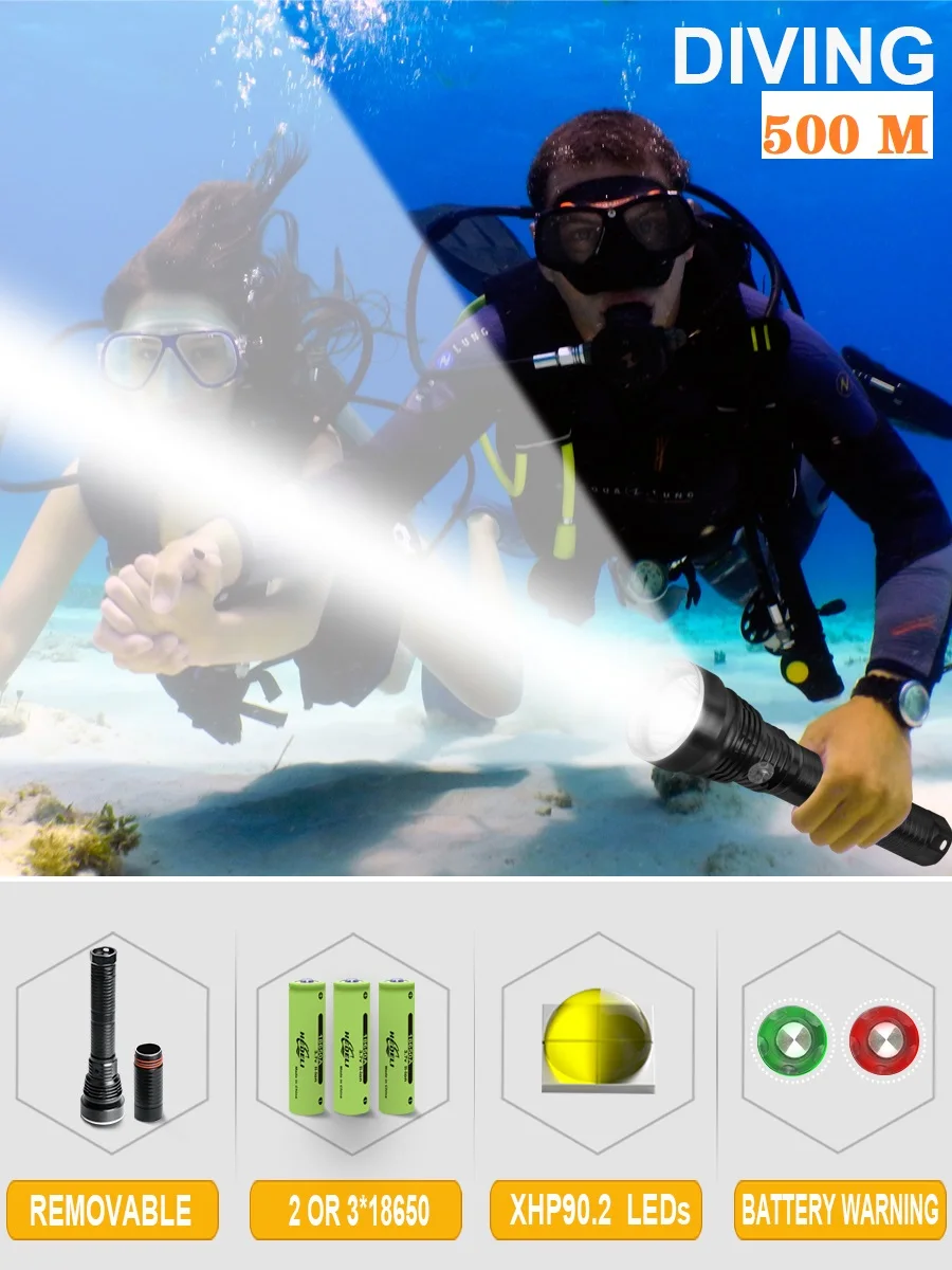 Название: Профессиональный фонарик для дайвинга XHP90.2 Модель светодиодный бусины: XHP90.2 Дальность: подводный 200-500 метров. Размер(См): 31*6*3,1(Съемный)
