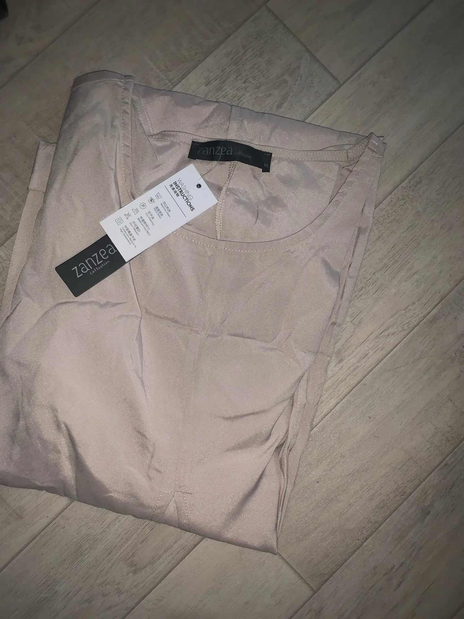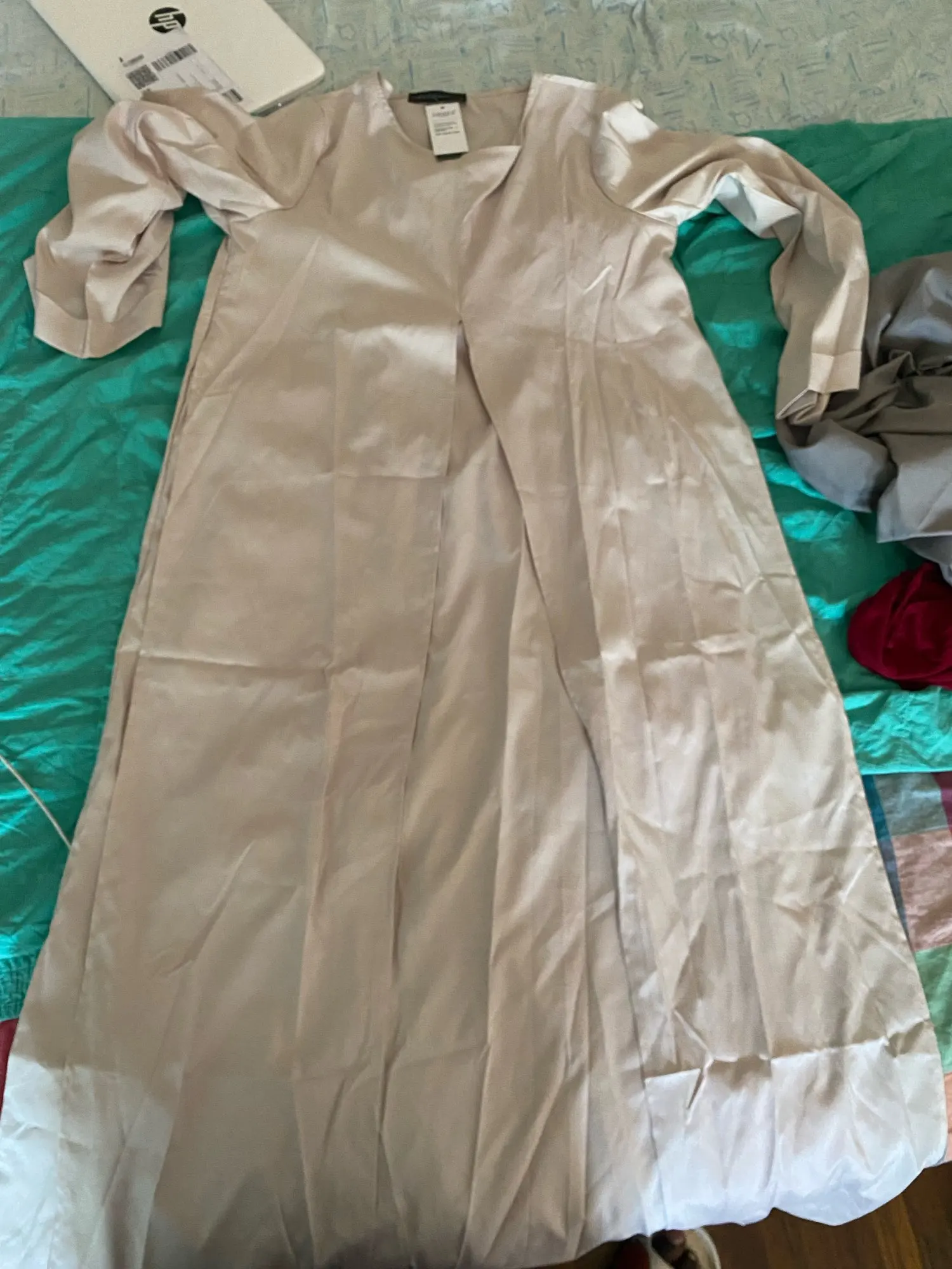 Прибыл Через полторы недели, очень красивый бежевый цвет, очень легкий, но немного прозрачный, легкий запах, но ничего серьезного, он быстро уходит. Я измеряю 1m56, и я взял размер S, и это никель!