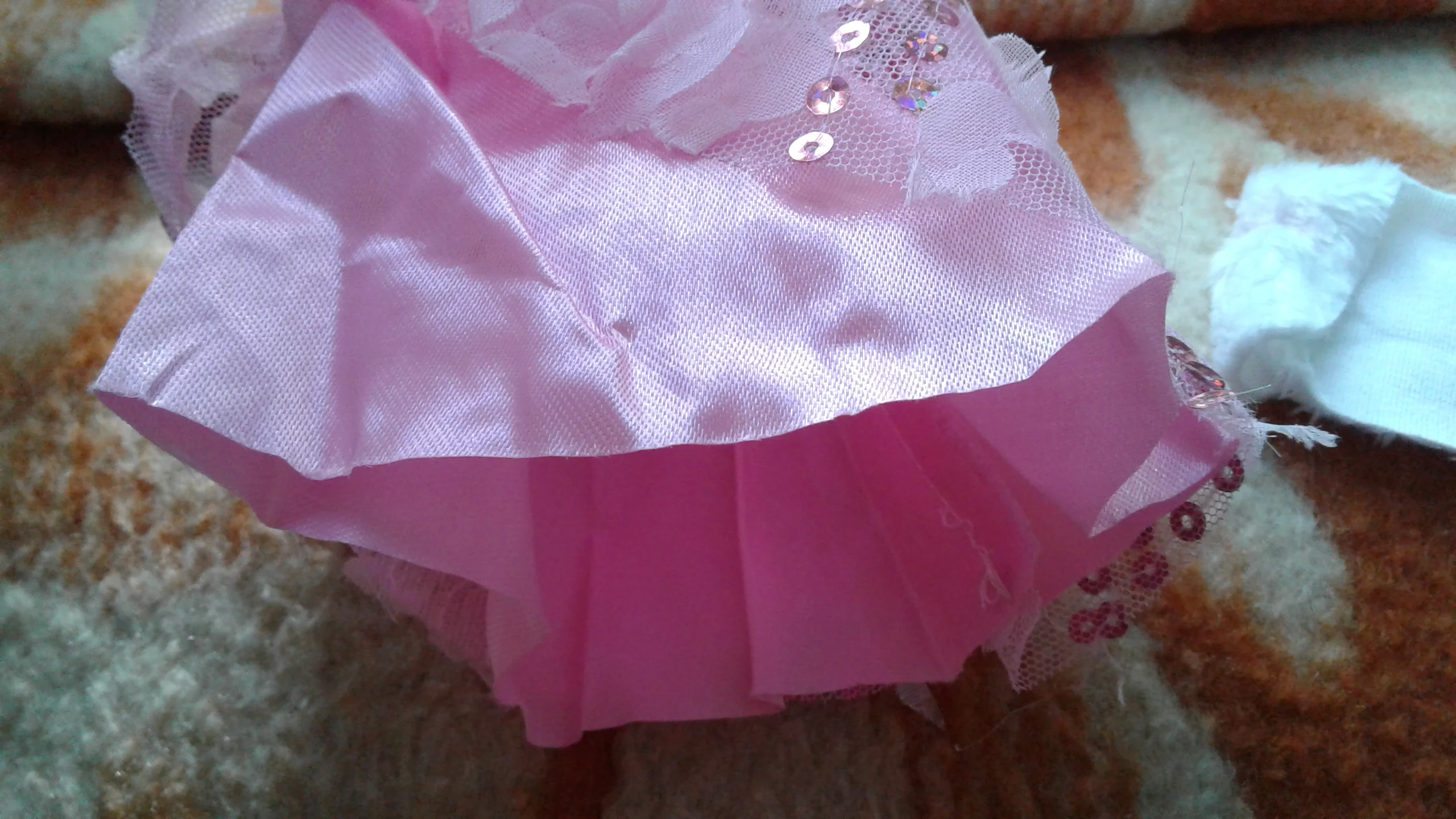 Кофточка с крупным пятном и осыпающимся "мехом", юбка из необработанной ткани, тонкая, жёсткая и неприятно шуршит, материал похож на газету. Своих денег не стоит.
