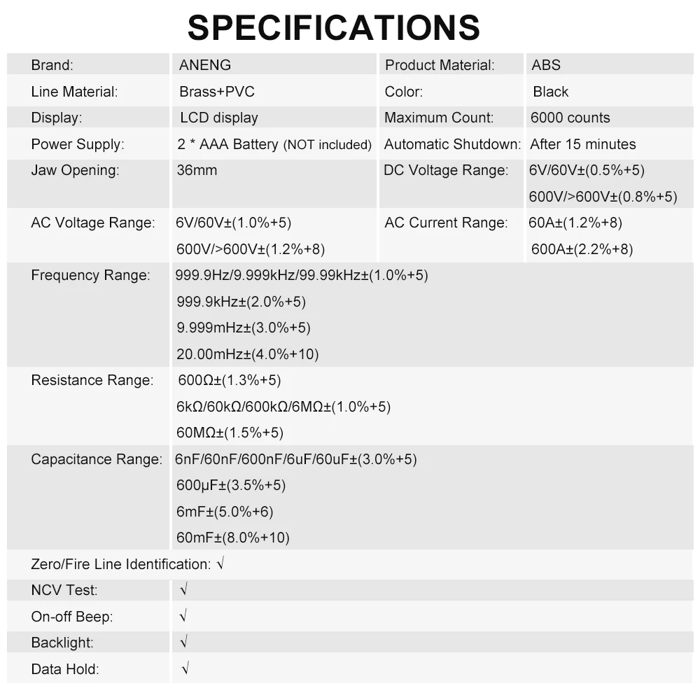 Особенности: -Компактный размер: портативный для переноски и простой в использовании в одной руке. -36 мм отверстие челюсти: 36 мм большое отверстие челюсти для измерения без прикосновения или прерывания цепи. -Автоматический диапазон: интеллектуальная эффективная работа для получения точных результатов. -600A Измерение переменного тока: 60A ~ 600A широкий диапазон измерения, подходит для различных проводов, удобный и точный. -Бесконтактное Обнаружение напряжения NCV: если вы хотите определить, есть ли напряжение переменного тока или электромагнитное поле в пространстве, вы можете получить передний конец зажимной головки счетчика близко к измеряемому объекту. Если есть, звуковой сигнал будет звучать, и светильник NCV будет мигать. -Функция удержания данных: удерживайте Измеренные данные для удобной проверки или наблюдения. -Функция подсветки: ЖК-экран с подсветкой для четкого отображения данных. -Подсказка низкого напряжения: когда появляется символ низкой мощности, необходимо вовремя заменить батарею. Недостаточная мощность может повлиять на точность результатов измерений. -Автоматическое выключение: если нет работы в течение 15 минут, счетчик автоматически отключится. -Оборудованные аксессуары: поставляется с одной парой тестовых зондов для удобного измерения. Черный чехол на молнии предназначен для удобного хранения и переноски. -Многофункциональное измерение: напряжение переменного/постоянного тока, ток переменного тока, сопротивление, емкость, частота, тест NCV, испытание ВКЛ-ВЫКЛ. Технические характеристики: Продукт Материал: АБС-пластик Материал лески: латунь + ПВХ Цвет: черный Источник питания: 2 * AAA батареи (не входят в комплект) Автоматическое выключение: через 15 минут Дисплей: ЖК-дисплей Дисплей Максимальное количество: 6000 штук Отверстие челюсти: 36 мм Диапазон напряжения постоянного тока: 6 В/60 В ±(0.5% + 5), 600 В/>600 В ±(0.8% + 5) Диапазон напряжения переменного тока: 6 В/60 В ±(1.0% + 5), 600 В/>600 В ±(1.2% + 8) Диапазон переменного тока: 60A ±(1.2% + 8), 600A ±(2.2% + 8) Частотный диапазон: 999,9 Гц/9,999 кГц/99,99 кГц ±(1.0% + 5), 999,9 кГц ±(2.0% + 5), 9,999 МГц ±(3.0% + 5), 20,00 МГц ±(4.0% + 10) Диапазон сопротивления: 600Ω ±(1.3% + 5), 6k Ω/60k Ω/600k Ω/6MΩ ±(1.0% + 5), 60 МОм ±(1.5% + 5) Постоянной ёмкости, универсальный конденсатор Диапазон: 6nF/60nf/600nf/6 мкФ/60 мкФ ±(3.0% + 5), 600μF ±(3.5% + 5), 6mF ±(5.0% + 6), 60 МФ ±(8.0% + 10) Определение нулевой/пожарной линии: и радиус; NCV тест: и radic; ВКЛ-ВЫКЛ звуковой сигнал: и радиус; Подсветка: и radic; Хранение данных: и radic; Размер изделия: прибл. 180*60*28 мм/7,09*2,36 * 1.1in Вес изделия: прибл. 128 г/4,52 унций Размер посылка: прибл. 23,5*10*4 см/9,25*3,94 * 1.57in Вес посылка: прибл. 281 г/7,69 унций Примечание: Пожалуйста, прочитайте руководство по использованию rs перед использованием. Упаковочный лист: 1 * клещи 1 * пара тестовых проводов 1 * сумка для хранения 1 * Руководство пользователя (на английском языке)