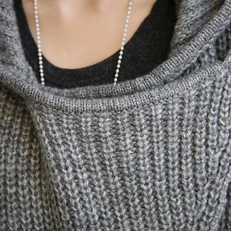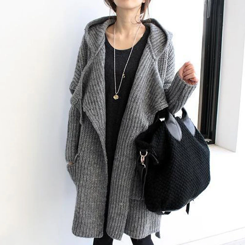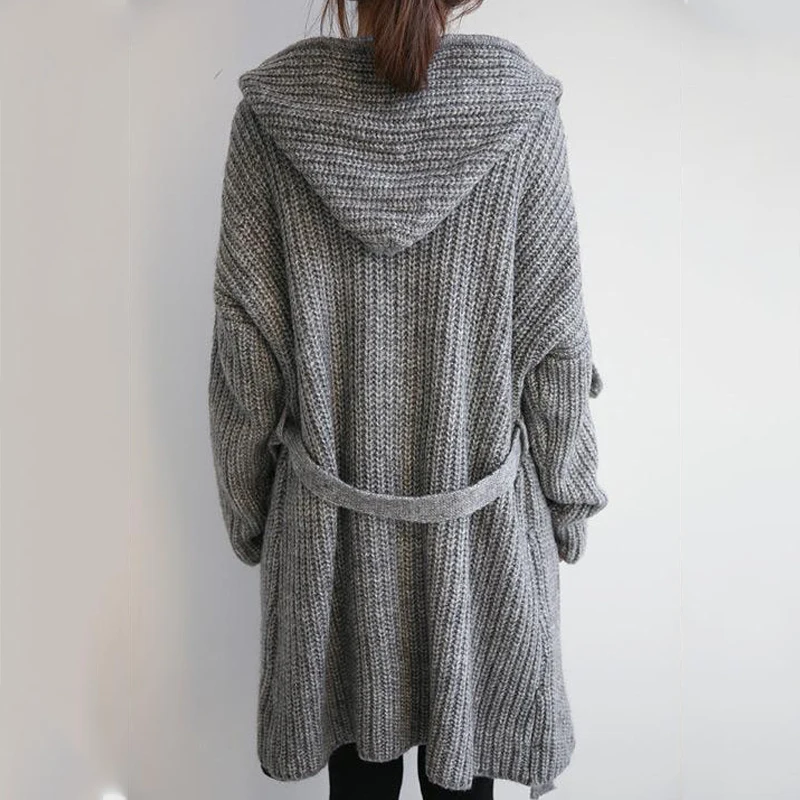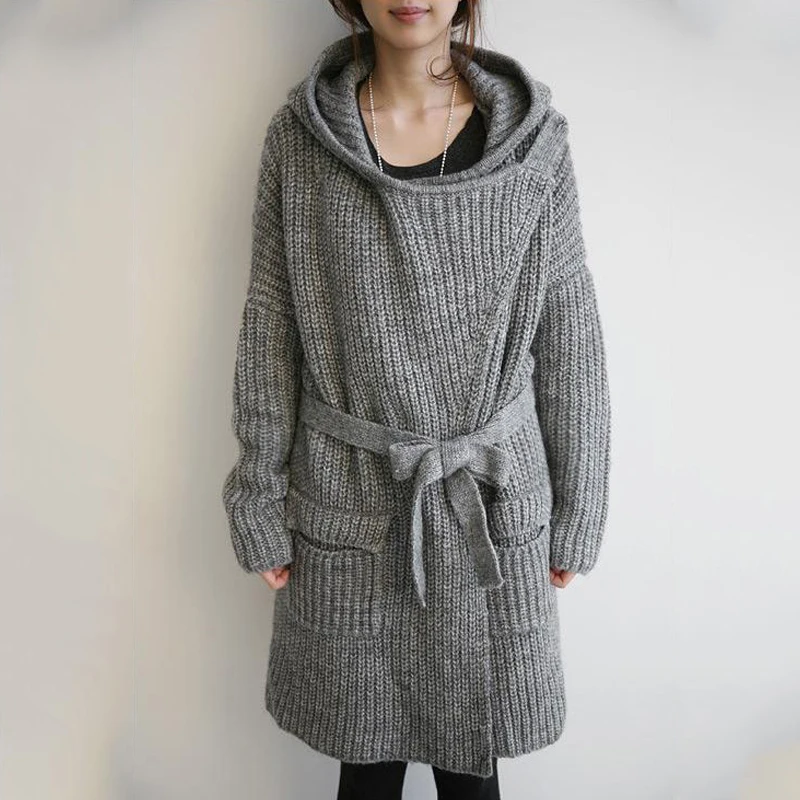 Длинный вязаный кардиган с капюшоном на осень и зиму, свободный плотный Однотонный свитер, Женский вязаный кардиган в Корейском стиле с карманами и поясом
