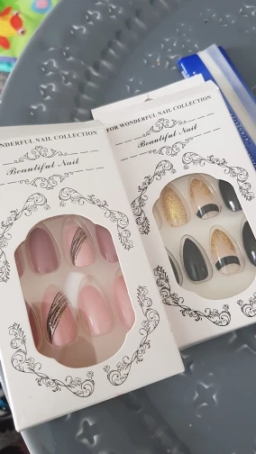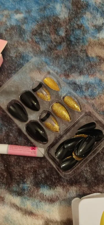 Ногти полностью соответствуют описанию, очень красивые,яркие! В коробке всего 24 ногтя и клей! Дизайн тоже классный!Я заказала черные и розовые! Обе пары ногтей красивые!