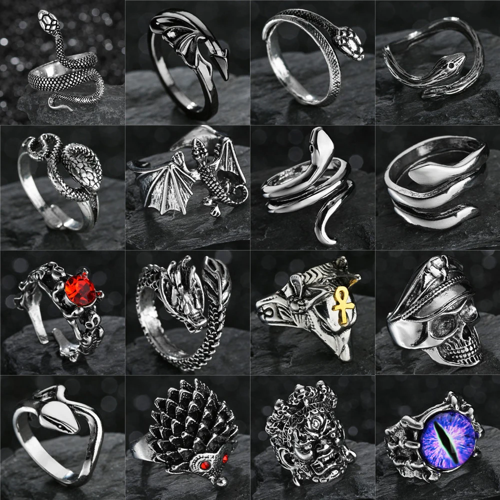 Кольцо в стиле ретро, панк, готическое, змеиное кольцо для мужчин, женщин, мужчин, с драконом, черепом, волком, стрелой, пиратом, сглазом, регулируемое под старину