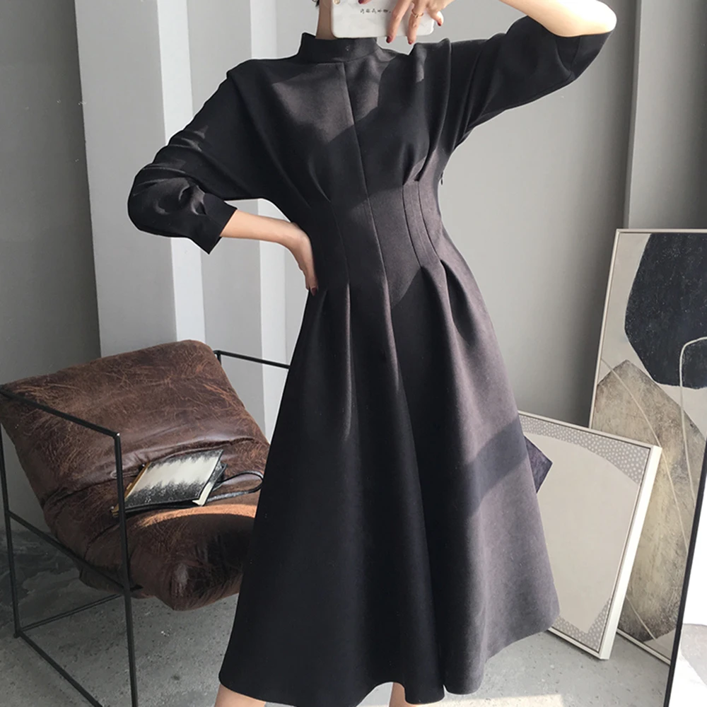 Осеннее Элегантное Черное женское платье средней длины с воротником-стойкой в Корейском стиле, элегантный пуловер с высокой талией, шикарные офисные женские платья