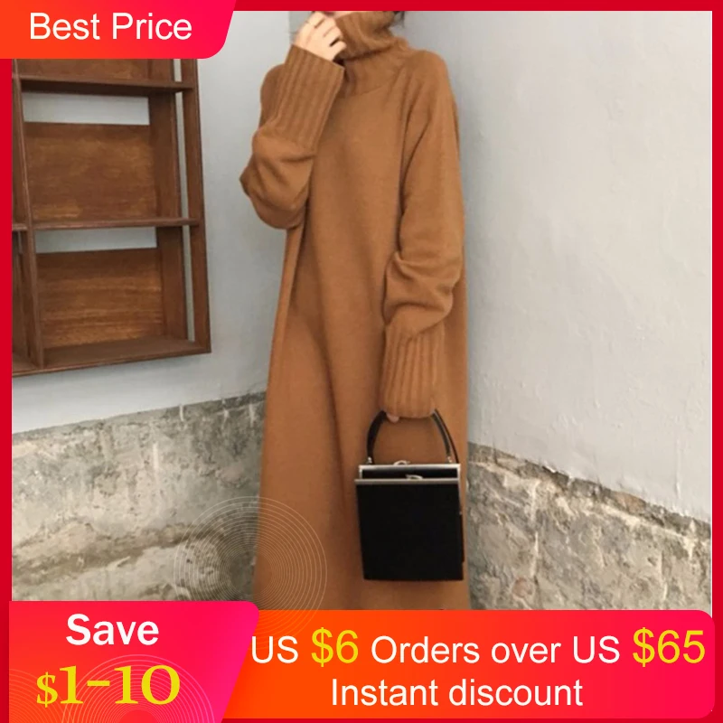 Женское трикотажное платье-свитер с высоким воротником, корейское Повседневное платье-лапша на осень и зиму, эластичный свободный пуловер с длинным рукавом, длинное коричневое платье