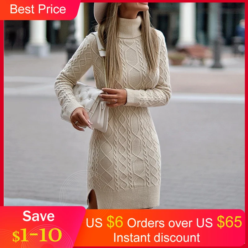 Женское осенне-зимнее толстое длинное платье-свитер с высоким воротником, женское прямое трикотажное платье-пуловер с длинным рукавом и разрезом, однотонное простое