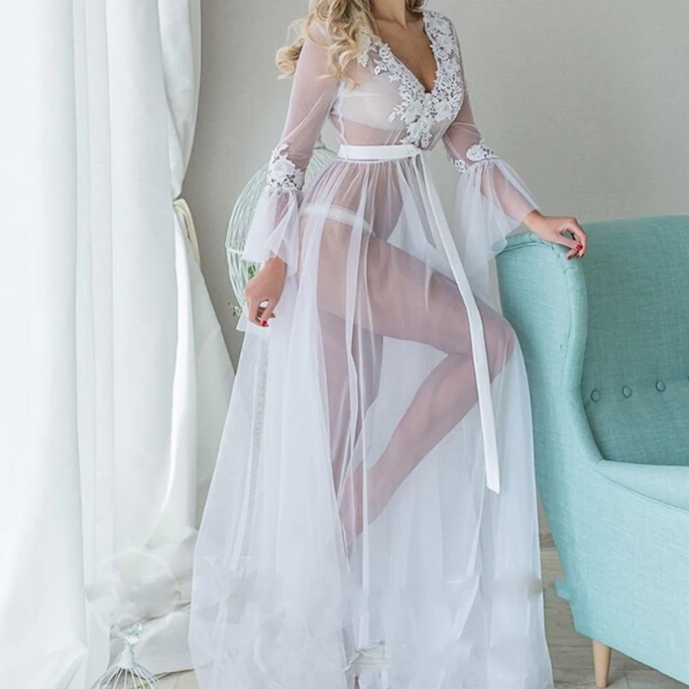Сексуальное Белое Кружевное Нижнее белье, женская прозрачная ночная рубашка, кружевное белье, пижама, кимоно, одежда для сна, длинная сорочка, размера плюс