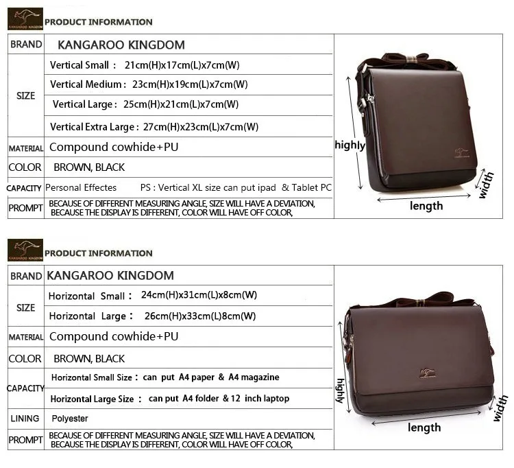 О размереВертикальный стиль,Маленький, 21 см (В) x17см (Д) x7см (Ш)Средний, 23 см (В) x19см (Д) x7см (Ш)Большой, 25 см (В) x21см (Д) x7см (Ш)Экстра большой, 27 см (В) x23см (Д) x7см (Ш)Горизонтальный стиль,Маленький, 24 см (В) x31 см (Д) x8см (Ш)Большой, 26 см (В) x33см (Д) x8см (Ш)Материал,Кожа + ПУЦвет, коричневый, черныйФункция, сумка на плечо, портфель, сумки для отдыхаСтруктура, внутри основной сумки, сумки для мобильных телефонов, сумки для документов, бит для карт