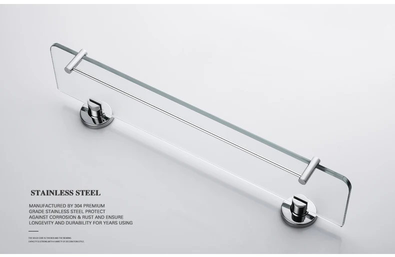 Особенности и характеристики:Держатели для шампуня для ванной комнаты/стеклянная полка/стеллаж для храненияМатериал: нержавеющая сталь SUS 304Использование: ванная комната/душевая комната/туалет/кухня/туалетТип: аксессуары для ванной комнатыУстановка: НастенныйЦвет: хромВключая все монтажные фитинги