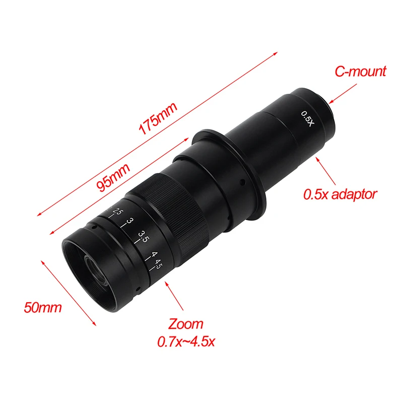 ОсобенностиВысокое качество, высокое разрешение, требует c-mount микроскоп камеры для использования.Адаптер с-креплением 0,5xКоэффициенты сигнала: 6,5: 1Рабочее расстояние: 50 ~ 155 ммЗум C крепление объективаУвеличение: 8X ~ 180XРазмер: 175 мм * 50 ммВес: 0,57 кгПожалуйста, не прикасайтесь к объективу руками, это вызовет царапины линзы. Если вам нужно обработать его, протрите его профессиональной тканью для камеры.